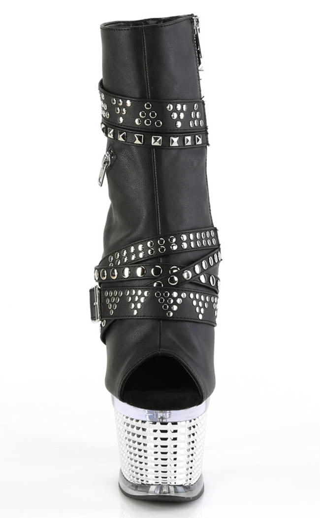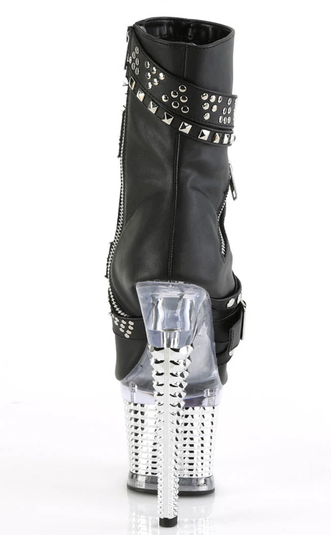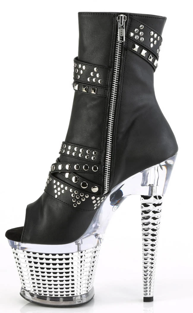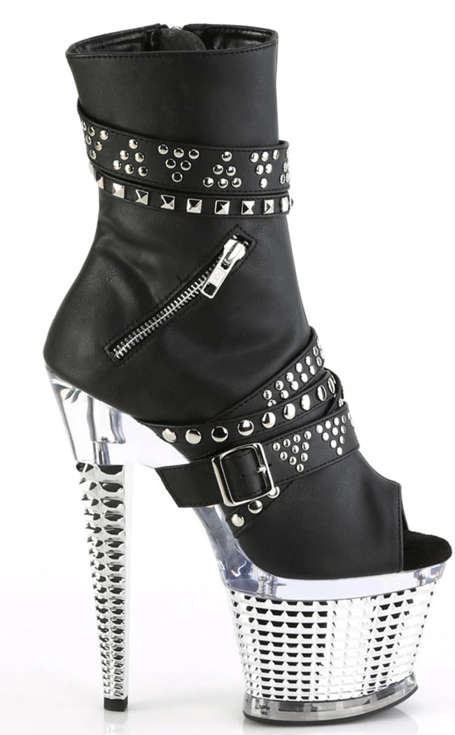 You’re a one-woman show, baby! The SPECTATOR-1015 ankle booties feature a vegan black matte upper with multiple studded straps, a zip decal and an inner zip closure. The platform is a clear/silver chrome with stud insets.