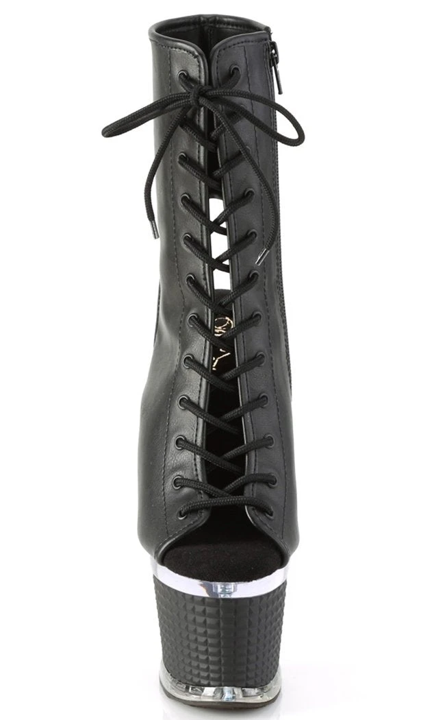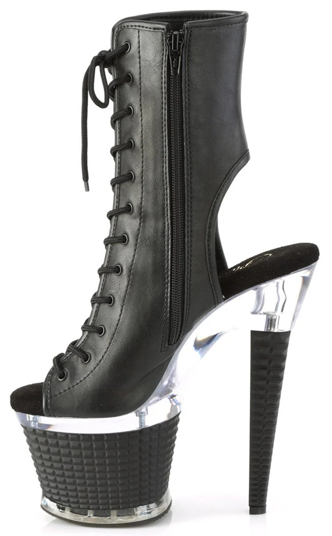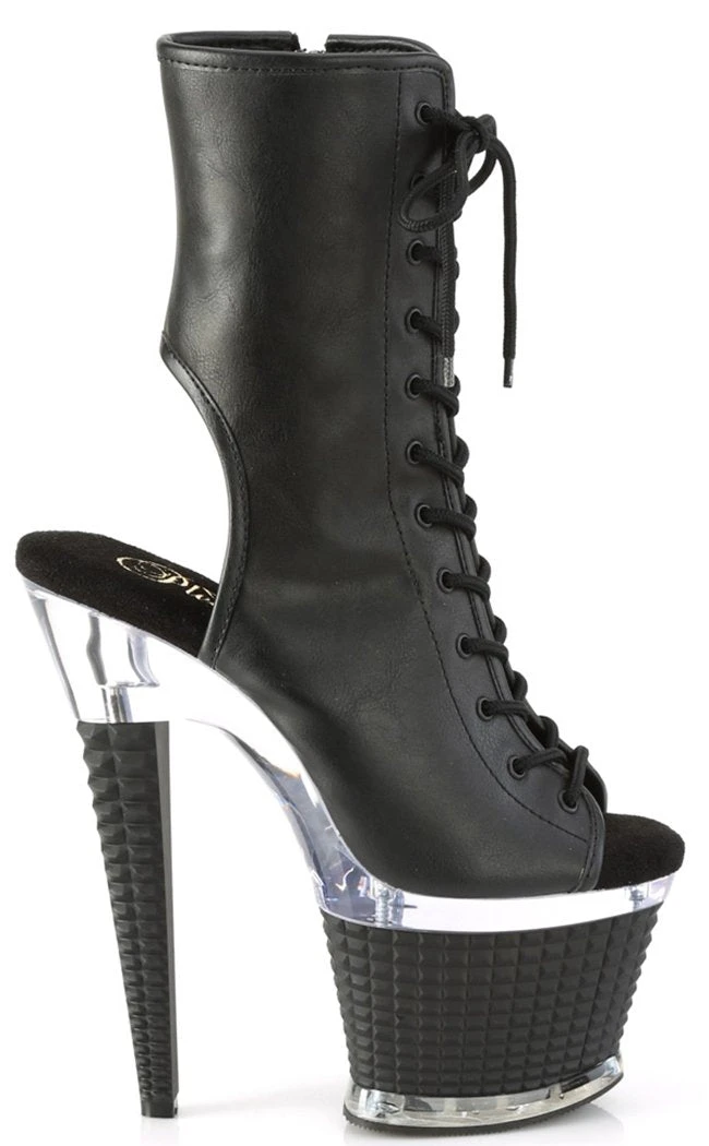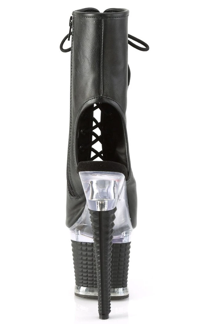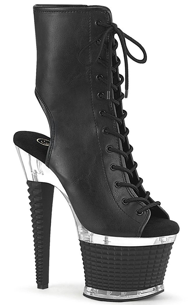You’re a one-woman show, baby! The SPECTATOR-1016 ankle booties feature a vegan black leather upper with a peep toe, ankle cutouts a side zip and a lace-up closure. The heel and platform are topped by a clear panel above a 3D stud look wrapping.