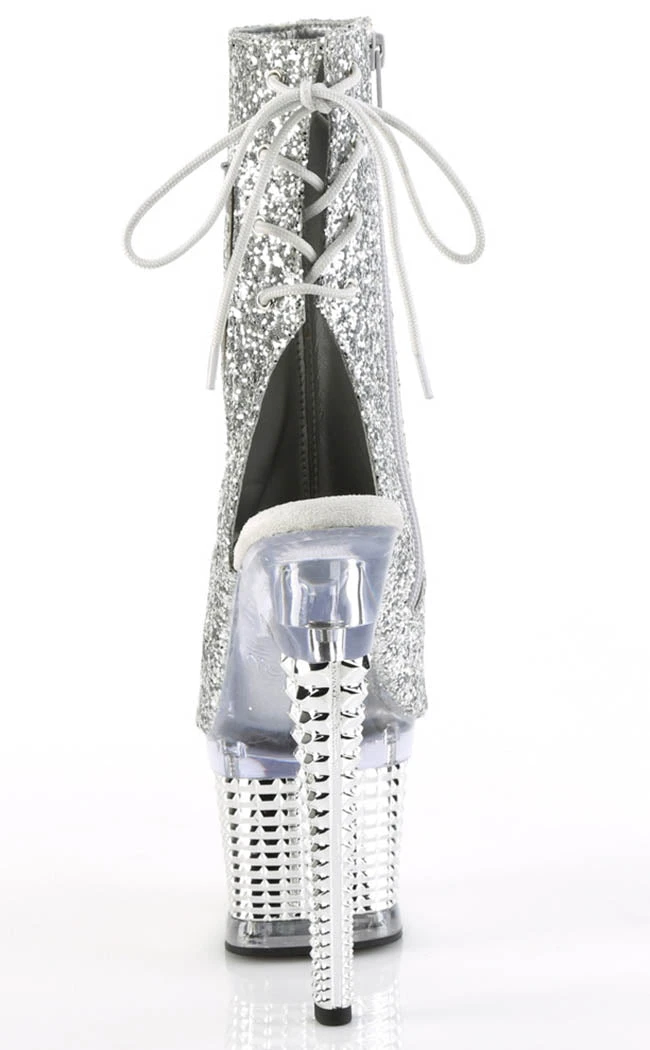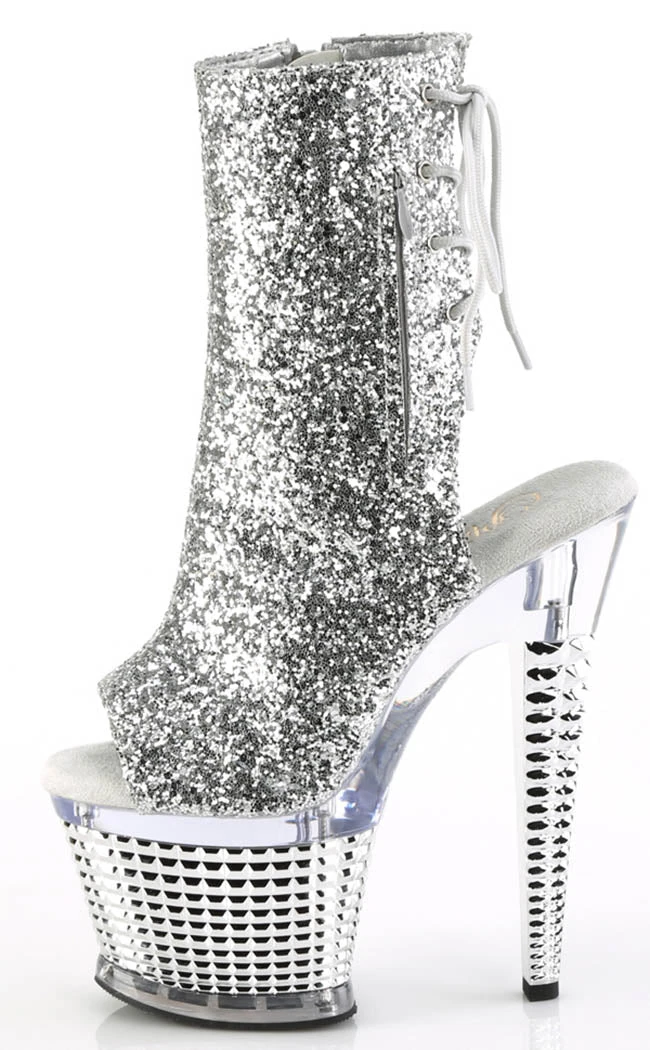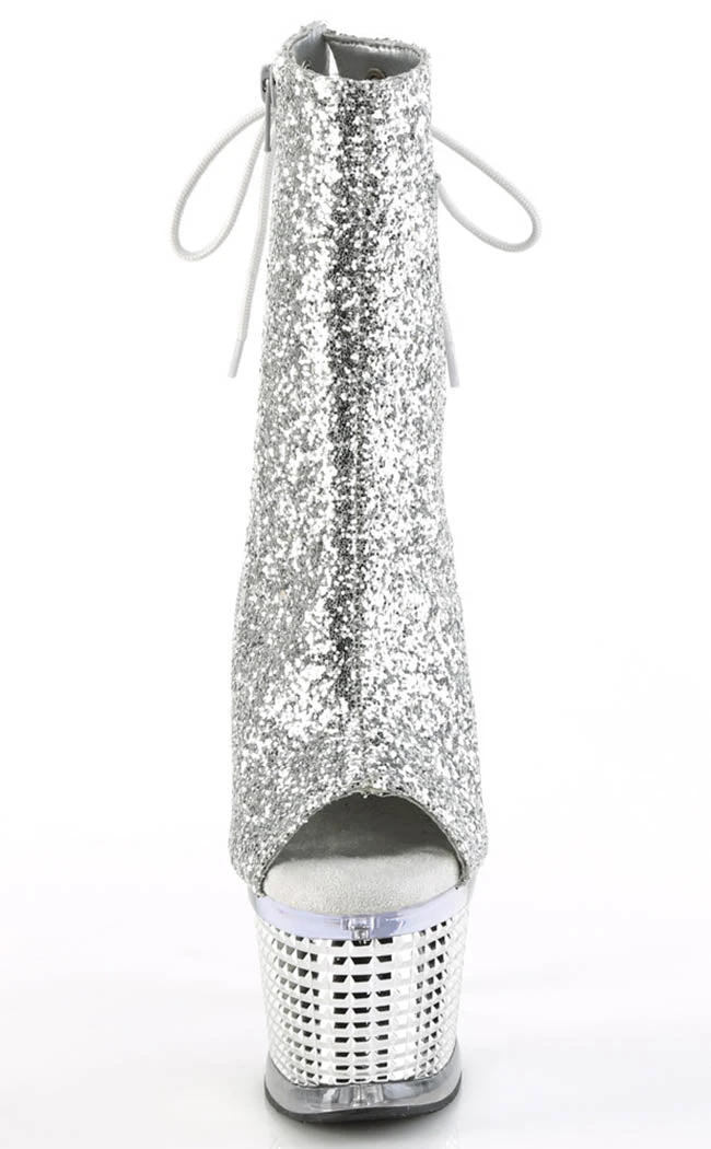 You’re a one-woman show, baby! The SPECTATOR-1018 ankle booties feature a vegan black glitter upper with a peep toe, ankle cutouts, rear lace-up and side zip. The heel and platform are topped by a clear panel above a 3D stud look wrapping.