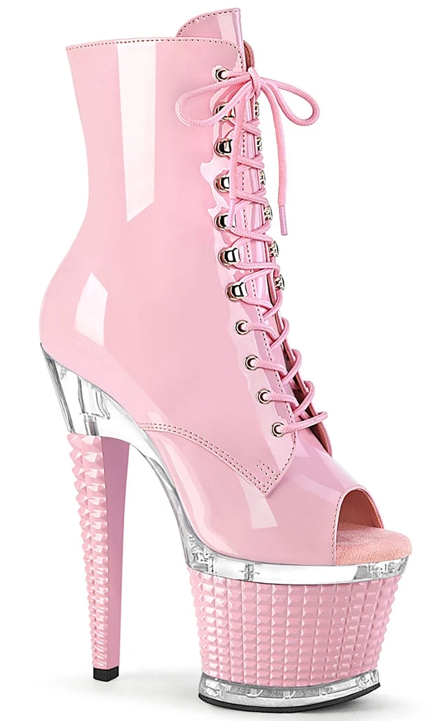 You’re a one-woman show, baby! The SPECTATOR-1021 ankle booties feature a vegan baby pink patent upper with a peep toe, lace-up and side zip. The heel and platform are topped by a clear panel above a 3D stud look wrapping.