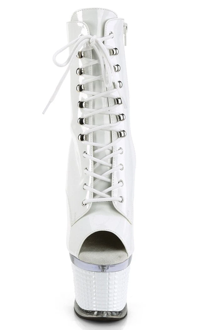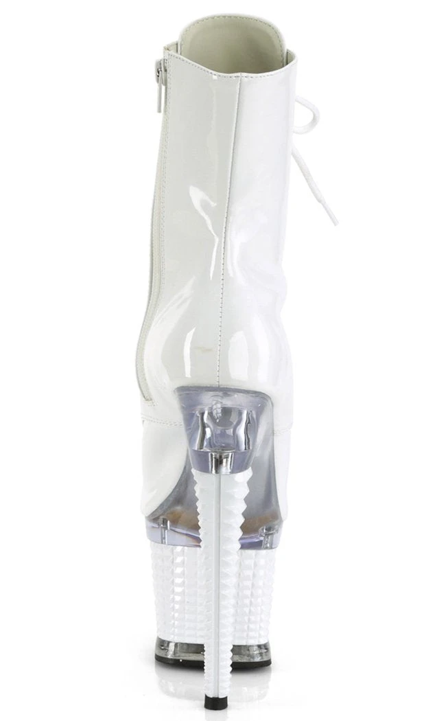 You’re a one-woman show, baby! The SPECTATOR-1021 ankle booties feature a vegan white patent upper with a peep toe, lace-up and side zip. The heel and platform are topped by a clear panel above a 3D stud look wrapping.