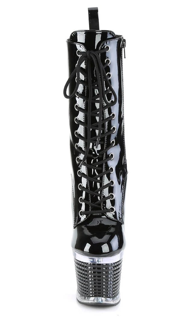 You’re a one-woman show, baby! The SPECTATOR-1040 ankle boots feature a vegan black matte upper that secure with a lace-up and side zip. The heel and platform are topped by a clear panel above a 3D stud look wrapping.