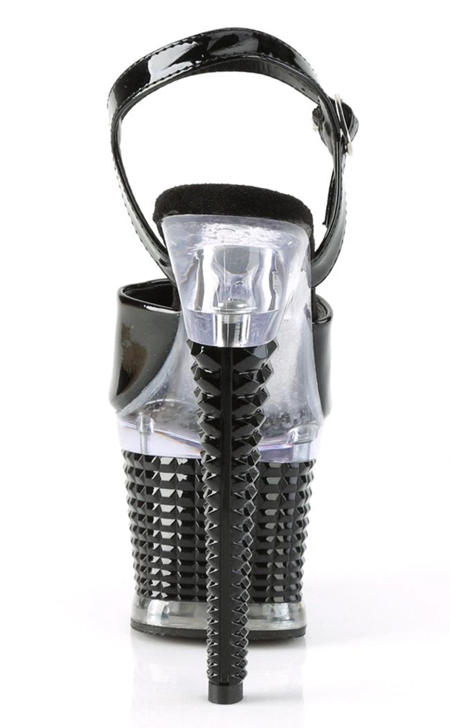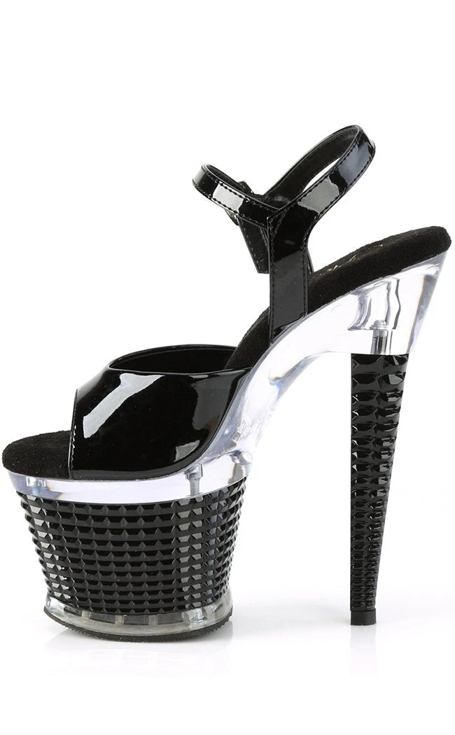 You’re a one-woman show, baby! The SPECTATOR-709 platforms are a sandal style heel with a peep toe and buckled ankle strap. The heel and platform are topped by a clear panel above a 3D stud look wrapping.