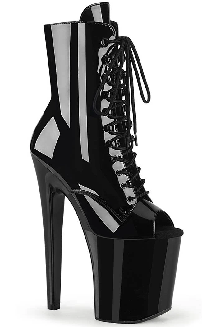 Take platforms to the xtreme! These peeptoe booties have an 8″ (200mm) spike heel and a 4″ (100mm) platform.  The upper is a vegan patent black that laces up and secures with an inner zip.