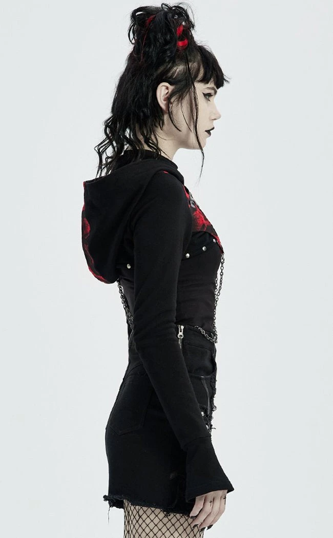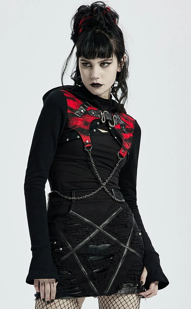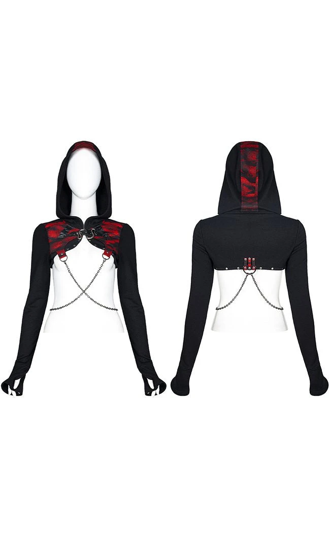 Kit up like a rebel warrior! This bolero style hood features two removable criss crossing chains that sit flatteringly over your midsection. The hood can be worn up or now depending on how much mystique you wanna exude. The front is done up with an xxxtra snake buckle to go with the rest of the heavy metal in yer outfit.