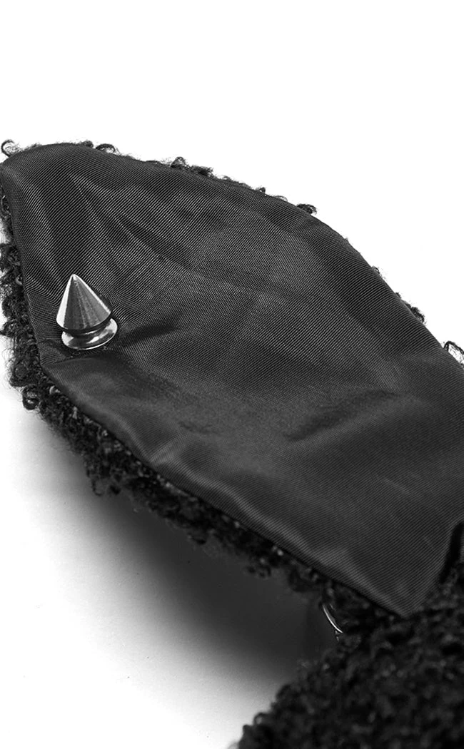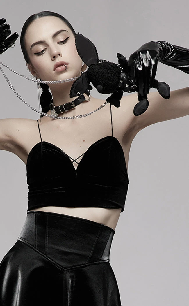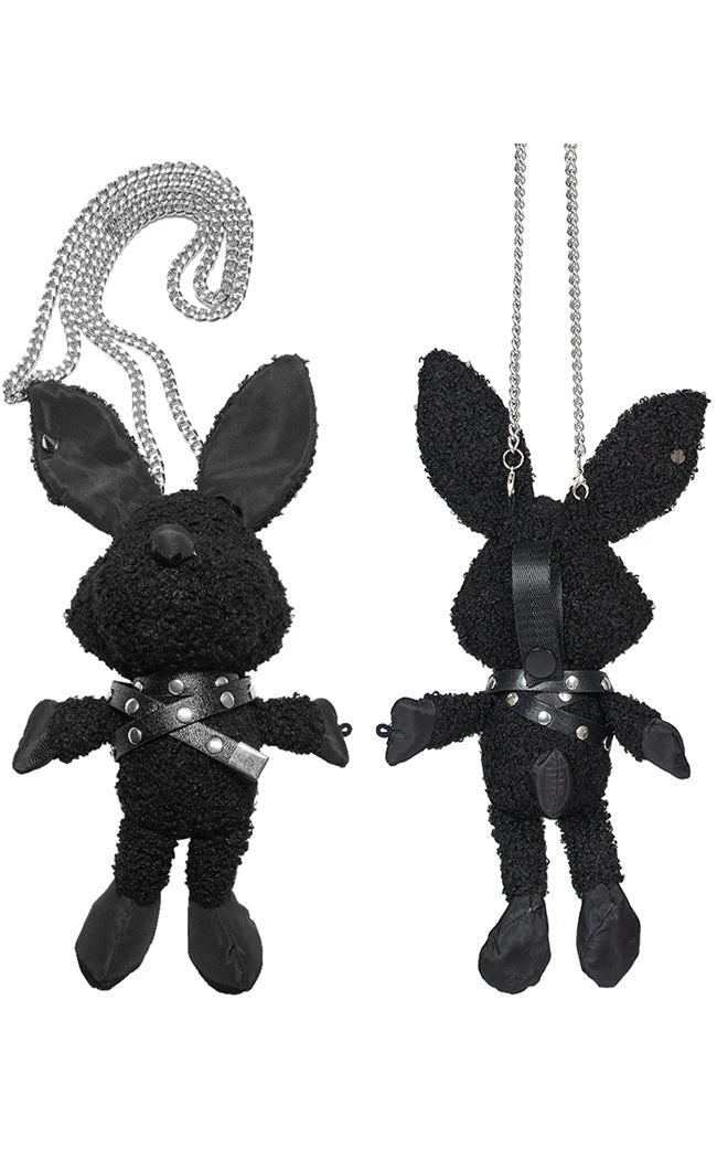 Add a little bondage baby to yer outfit with the Bitty Bunny Bag! This decorative bag is shaped like a rabbit, decked out in spiked straps across the chest, a cute button nose and a stud through its ear. The long-chain is detachable and the back comes with a hoop for you to slip it over your belt.