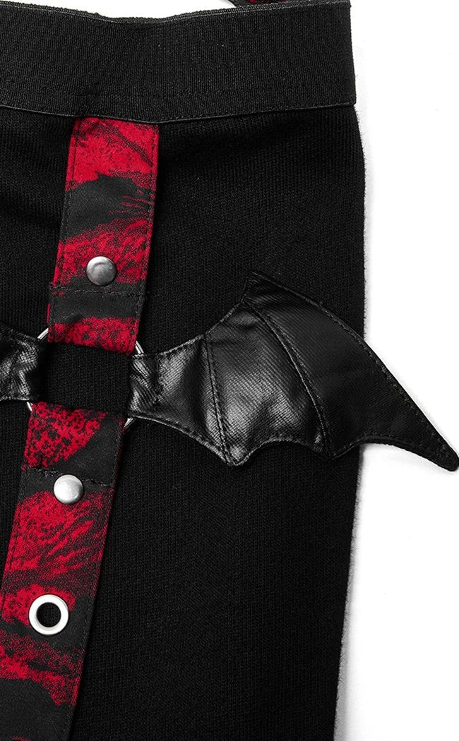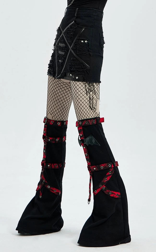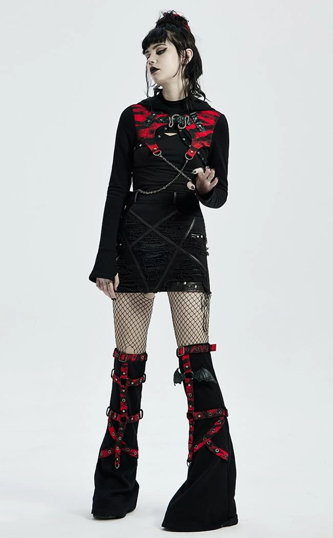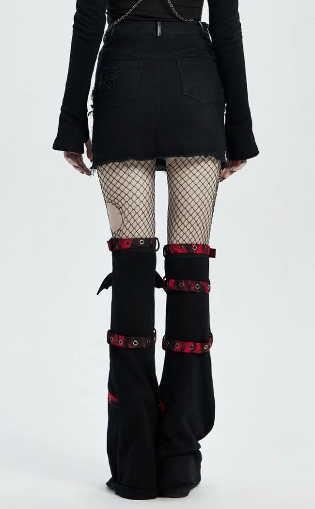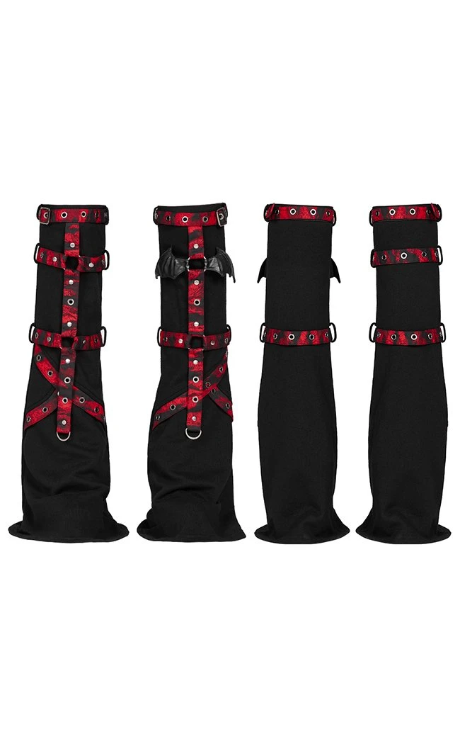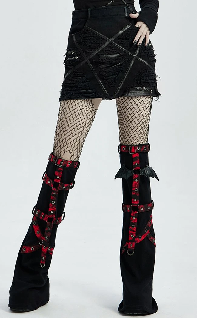 Add a little wild style to yer wardrobe with these wicked legwarmers. Made with a black stretch material that drapes beautifully, these babies are topped off with a wicked harness that features O rings and a set of bat wings.