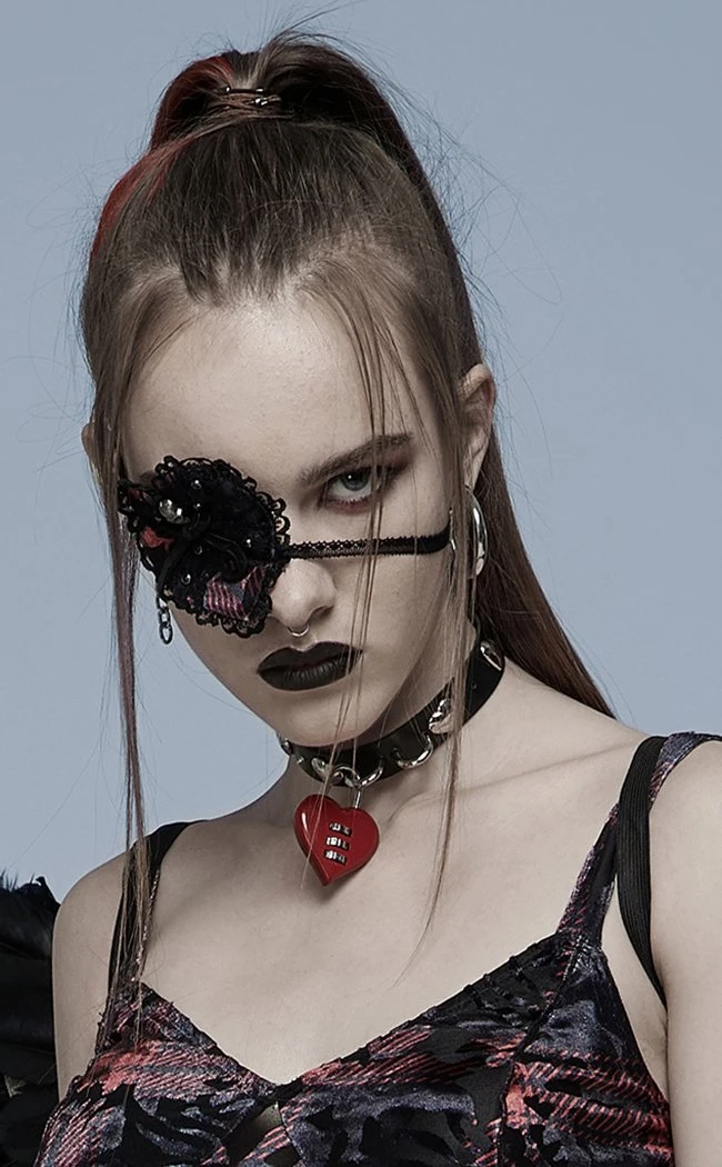 Ooze goth pirate vibes with the Calypso eyepatch! The patch is heart-shaped, featuring a skull charm and ribbon trimmed with lace. The reverse is made with super soft material, making it comfortable and easy to wear, securing with a soft lace tie.