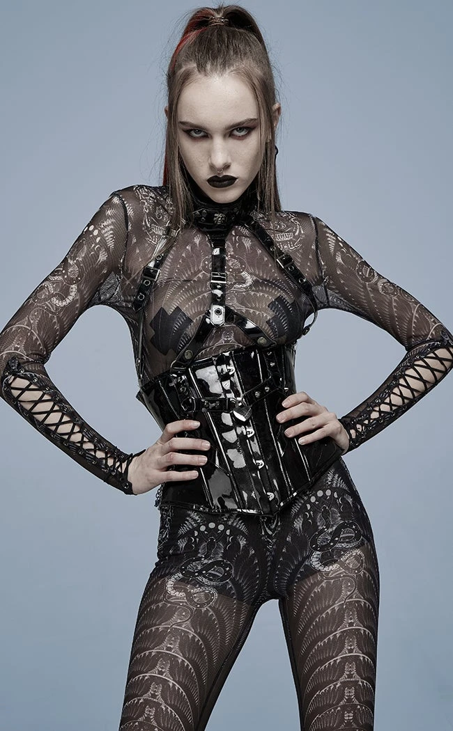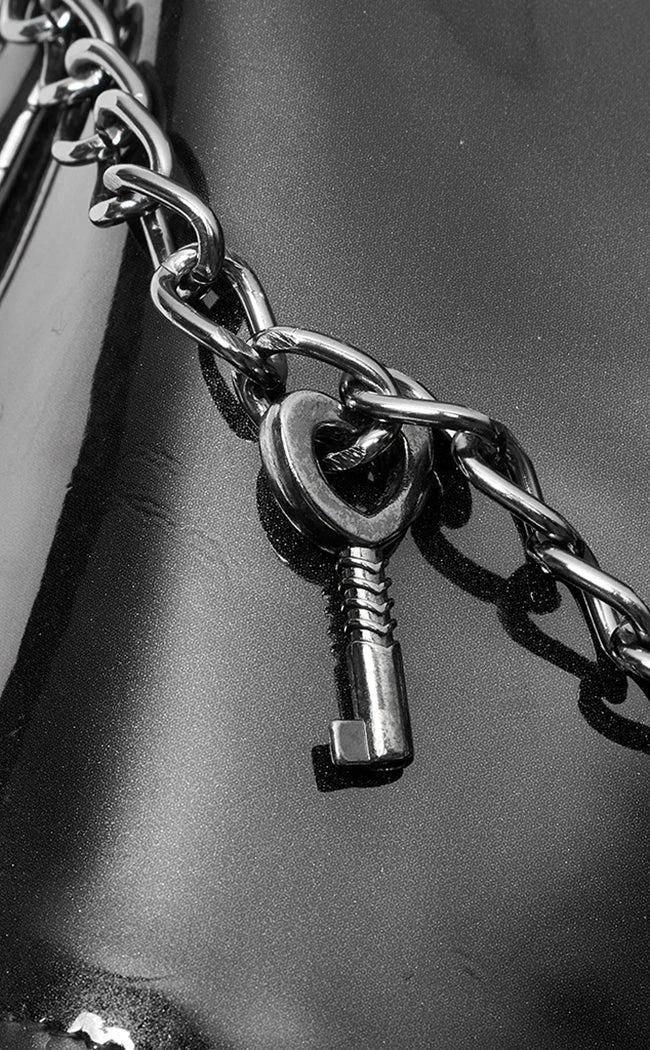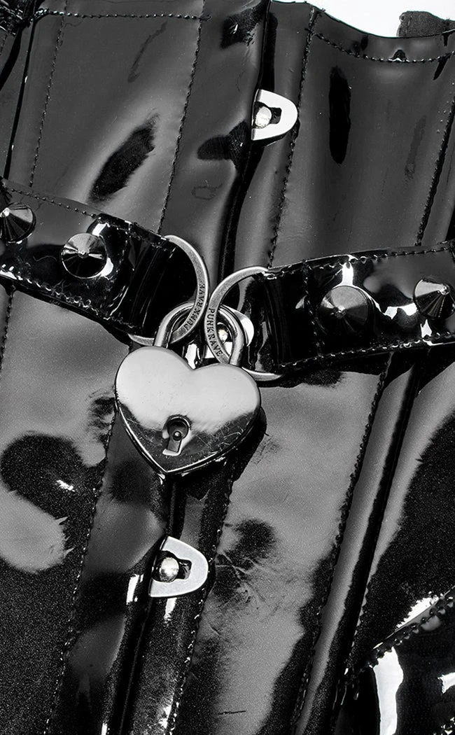Look devilishly good in the Ain’t Slick Patent Corset! Luxury vegan leather shapes to yer bod, securing with a classic fastener and fully adjustable thanks to the rear lacing. A halter harness amps up the sexy along with extra deets like a heart buckle, studs and a skull charm on the collar. The whole chest loop can be removed if the mood takes ya.