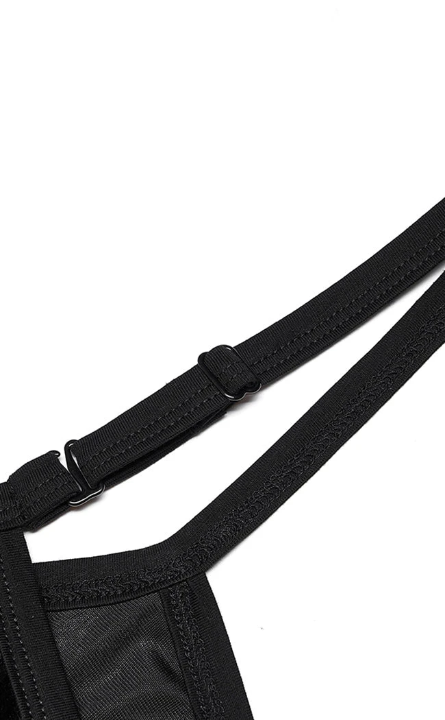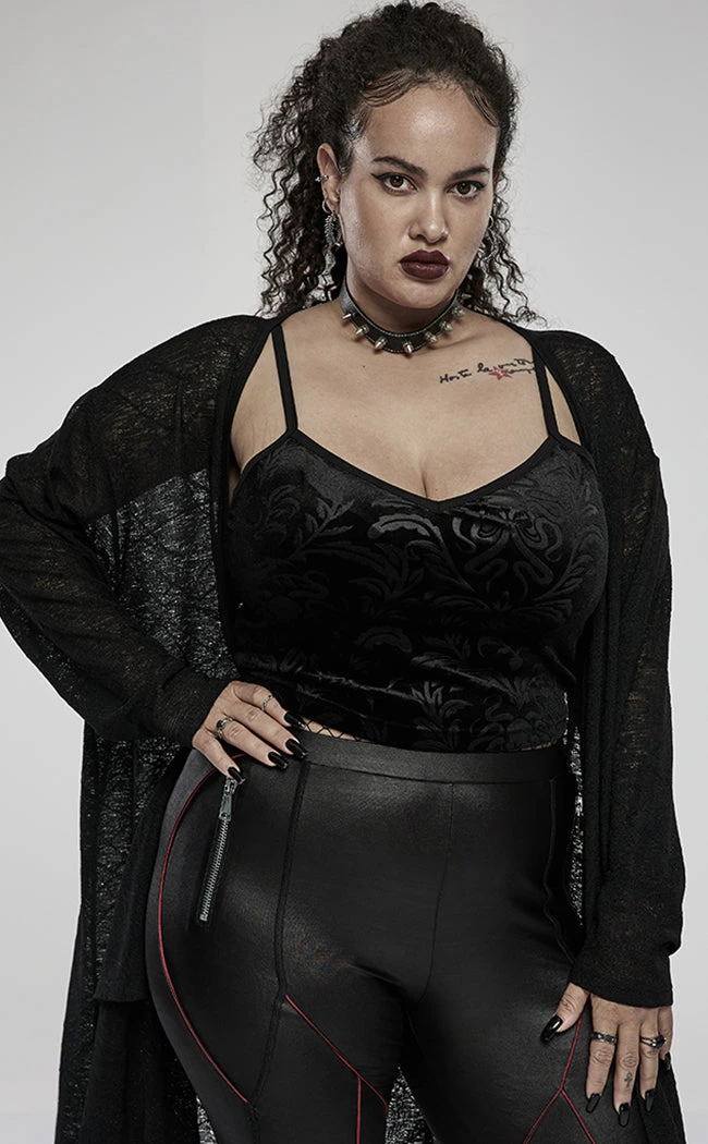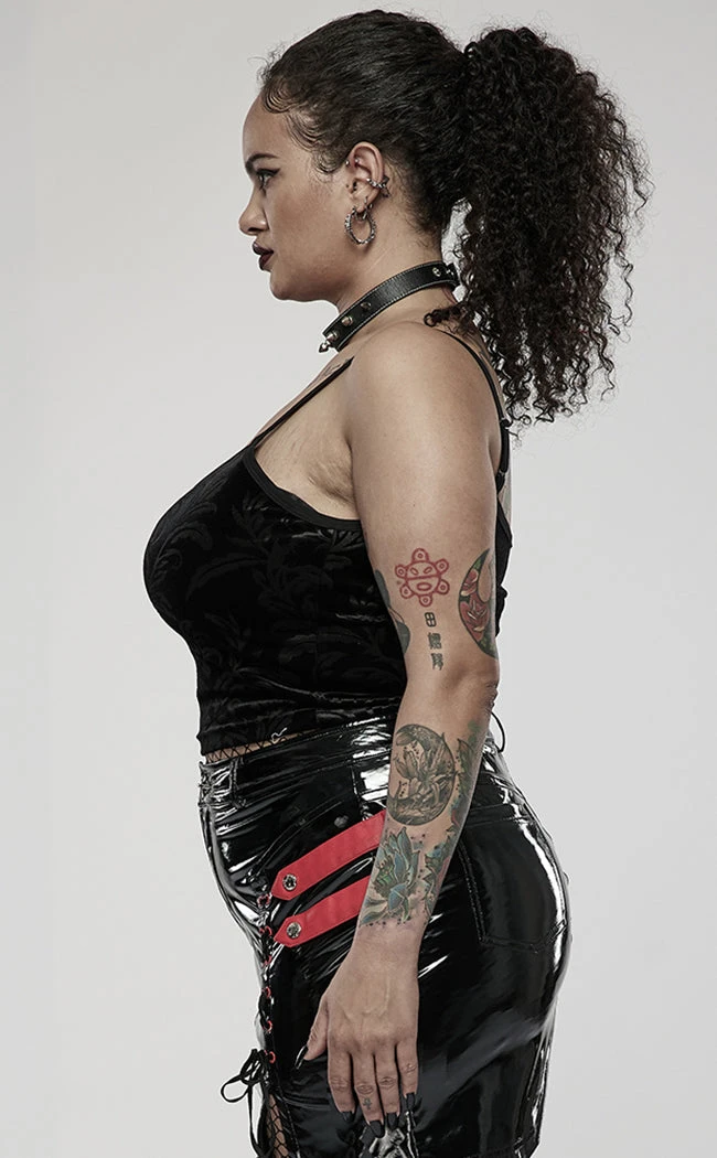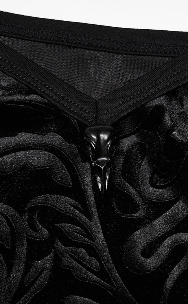 Unleash your inner cosmic horror with the Great Dreamer Cami! Soft, stretch velvet is embossed with a statement Cthulhu-baroque pattern and cropped to sit at the natural waistline. The cami straps are adjustable and a raven skull on the neckline adds a cute morbid touch.