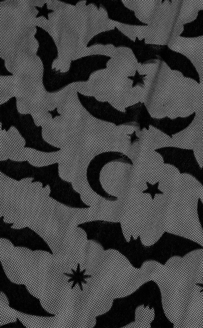 Turn the vampire vibes up to 11 in the Mina Flocked Dress! An outer layer of mesh is flocked with a pattern of bats, moons and stars, which forms long, wide sleeves for a touch of drama. The body features an opaque lining, forming a round neckline, fitted waist and skater skirt.