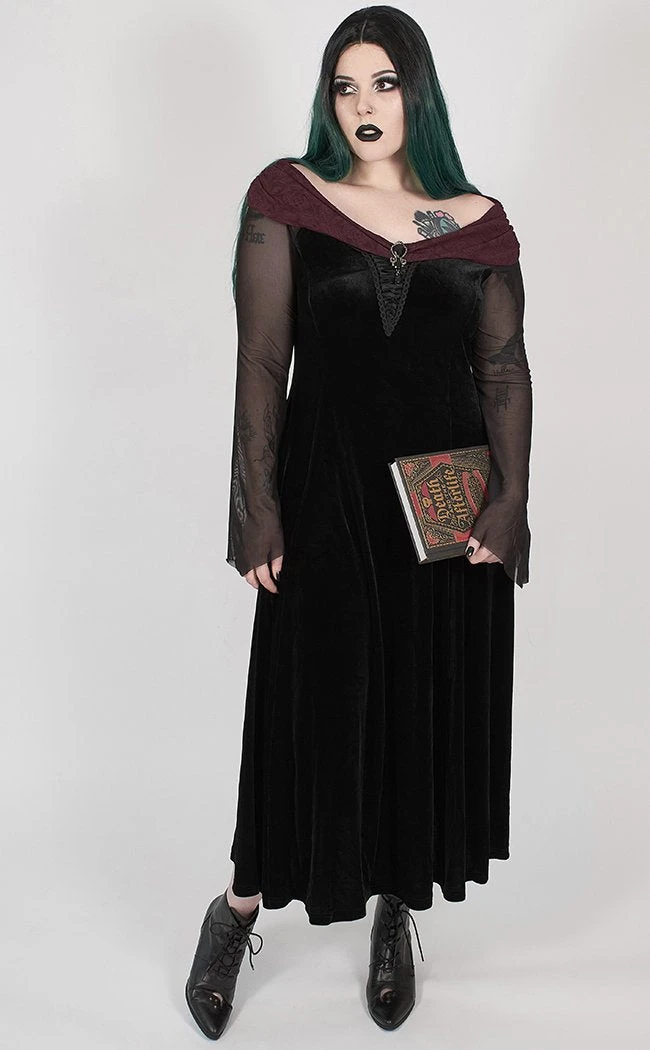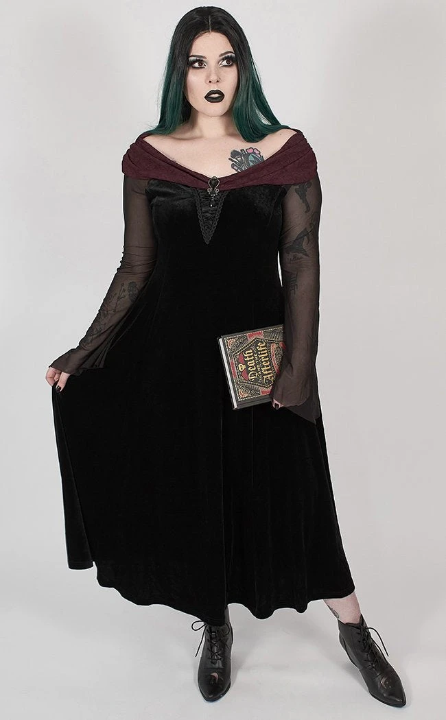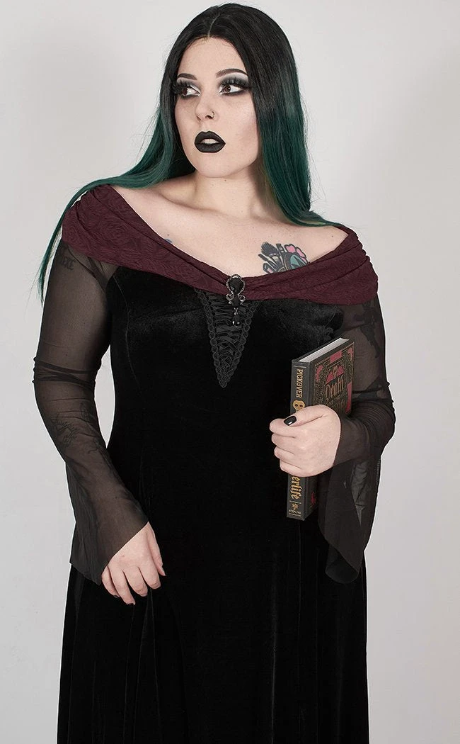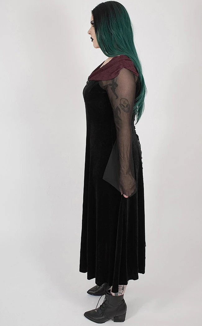 The wide neckline is trimmed in wine red with delicate folds, a removable elegant brooch at the centre. The sleeves are sheer to contrast with the midnight black velvet dress, which flows and sits just above the ankles.