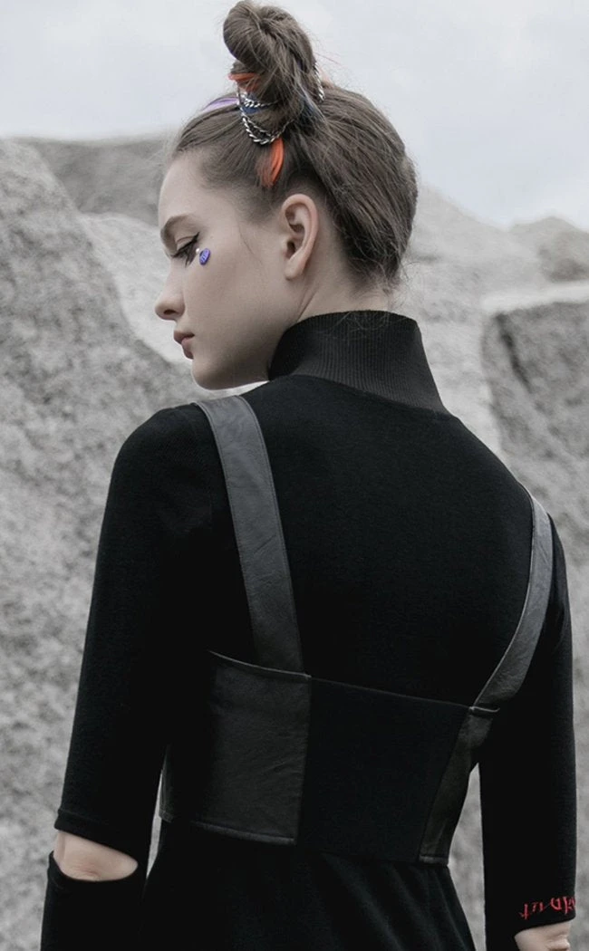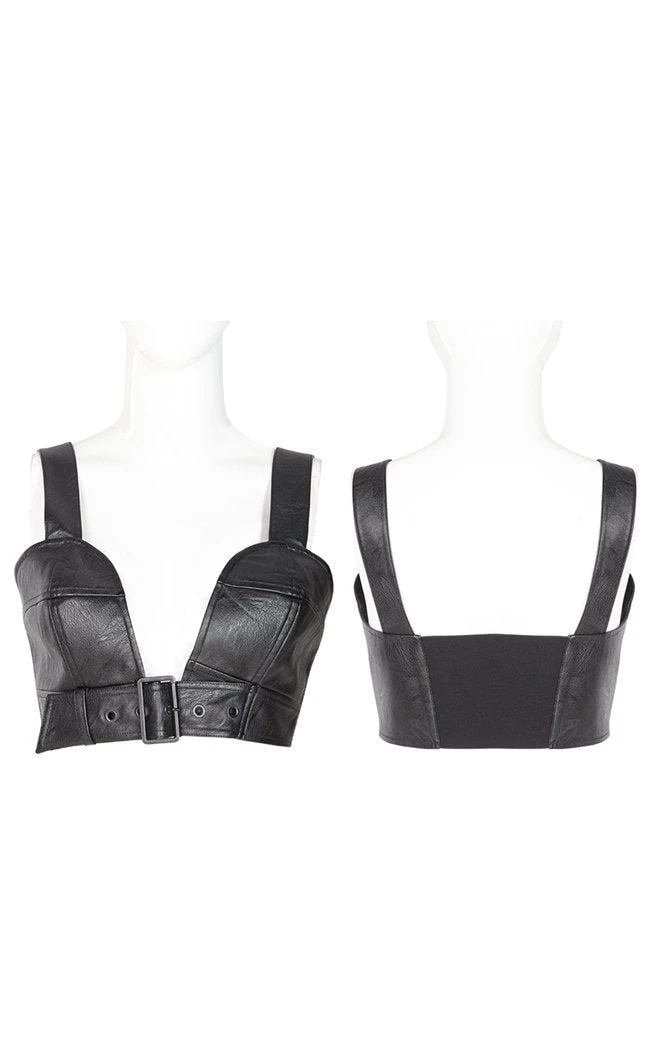 This crop cuts a deep V into a sultry neckline leading on from the thick shoulder straps and buckling just below the chest. The band at the rear is incredibly stretchy to sit comfortably on yer bod.