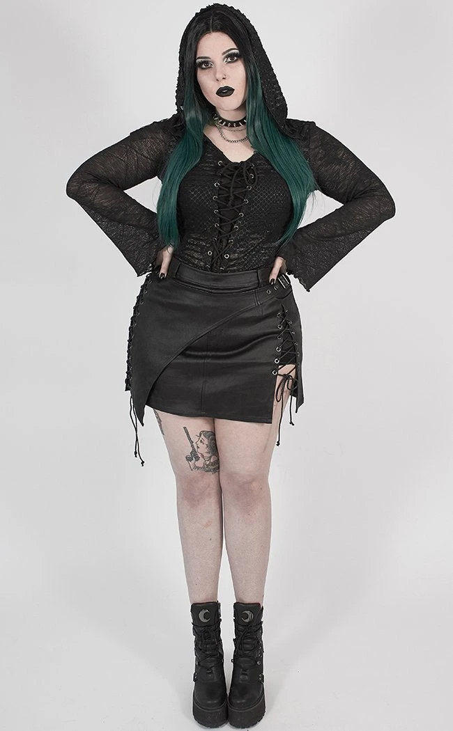 Leather and laces all in one kickass mini. The sides of this tight fitted mini skirt are kitted out with lace up decals that can be tightened or loosened as needed. The faux leather is cut into asymmetrical panels and topped off with a buckle at the waist.