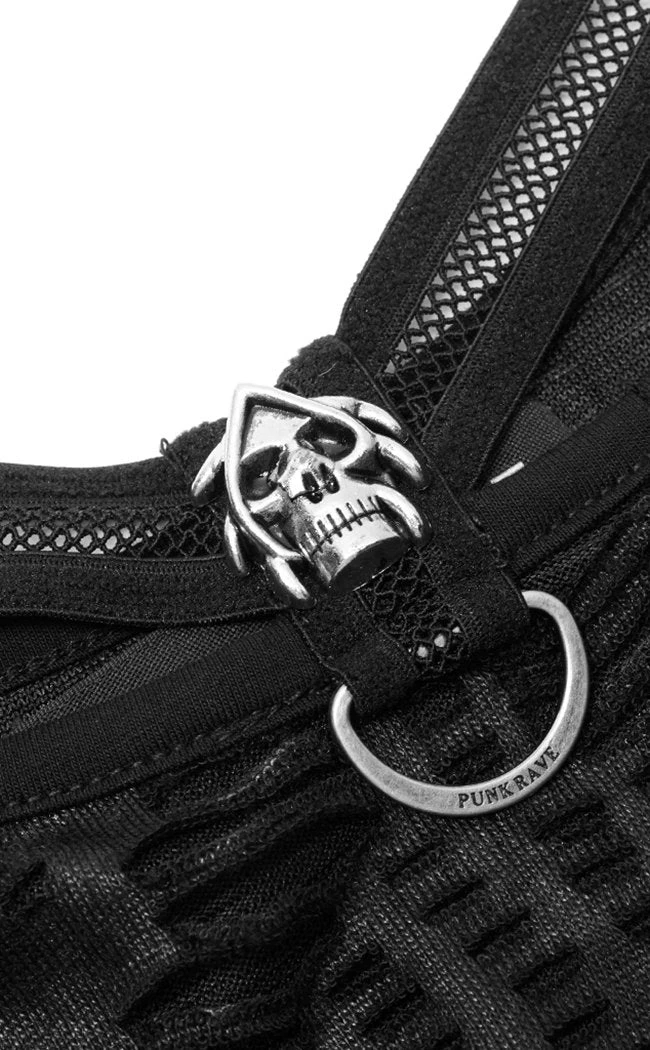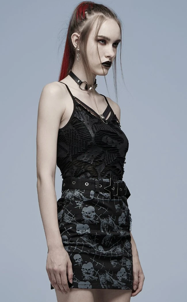 The Fallen Angel cami is a super versatile not-so-basic. The main fabric is a soft, shredded knit that creates a unique texture. The neckline features two floating straps, showing off a skull charm and a D ring at the centre.