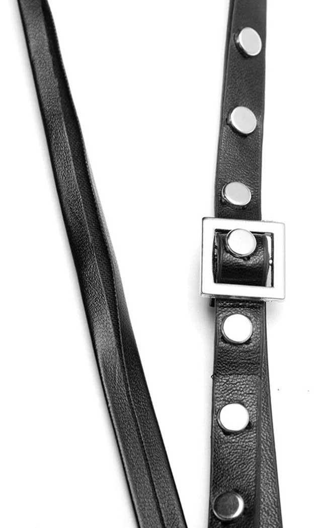 The body of the skit is cut to a short length and sits high on the waist, shaping itself around and under the chest. The two vegan leather straps are fully adjustable and studded to hell and back ! It also fastens at the back with a zip for easy on/off.