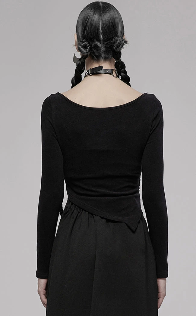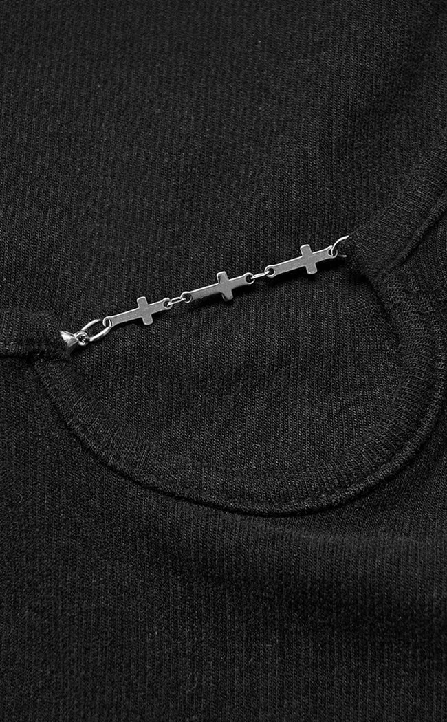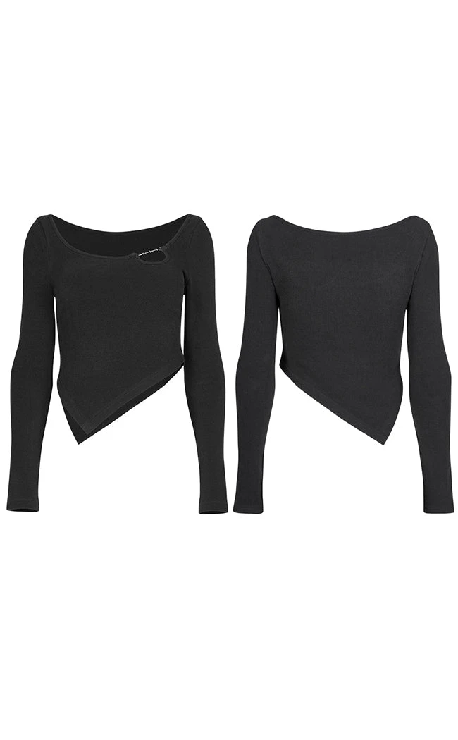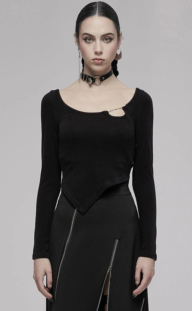 Complete yer wardrobe with the not-so-basic Love Bites Top! This cost long sleeve features a slightly cropped, asymmetrical waistline and a wide, round neckline. The neckline is interrupted by a cheeky cutout with a chain of crosses, adding a cheeky detail to this versatile styling piece.