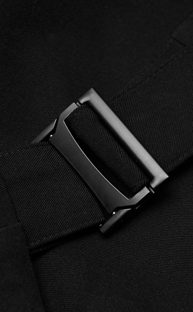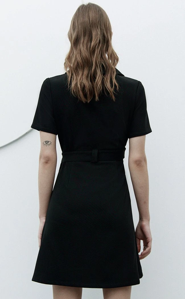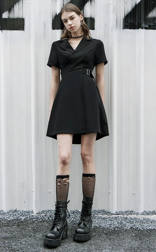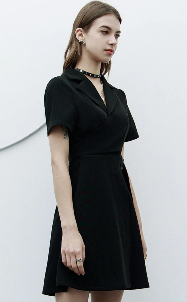 Get yourself lookin’ chic in threads as black as your soul! This blazer-look minidress has a slick collar, short sleeves and a v neck chest that secures with a buckle.Â