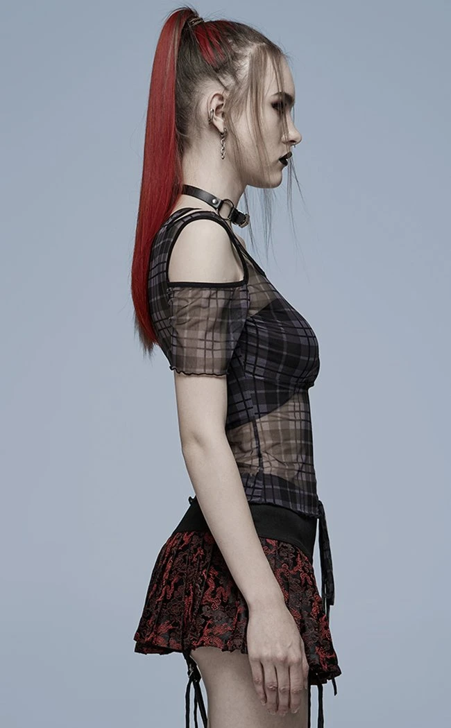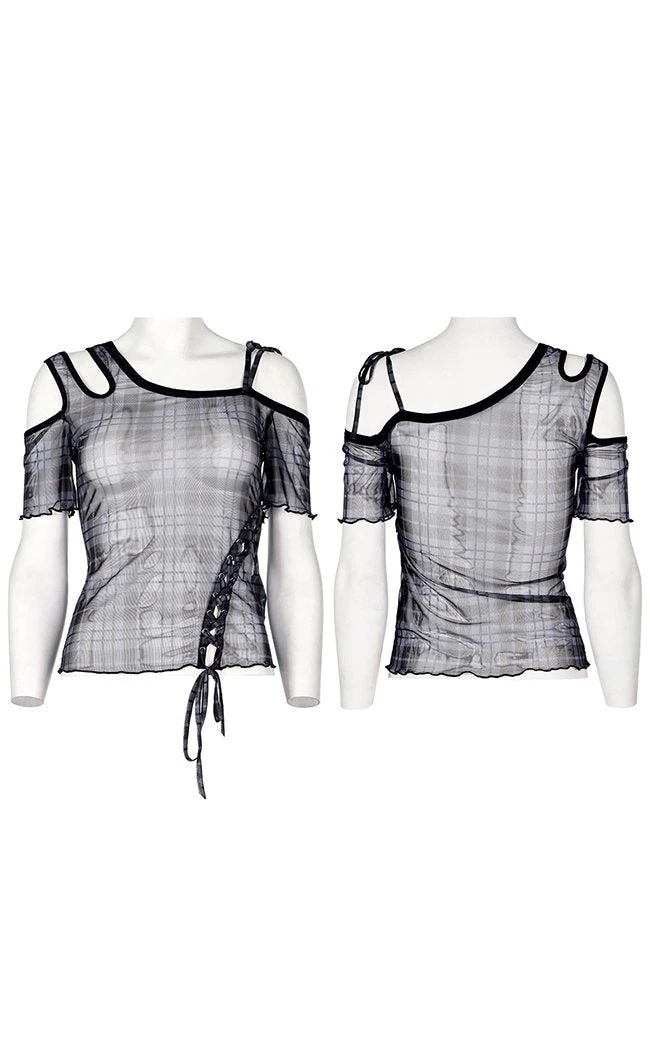 Step out with the statement Nemesis Mesh Top! The shoulders feature one cutout sleeve and one bardot/cami strap for a DIY feel, the soft stretch mesh printed with a black on black tartan. The front is cut into with a lace-up detail for an extra wrecked lewk.