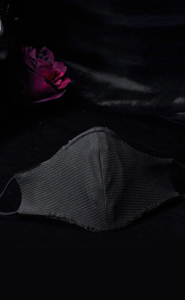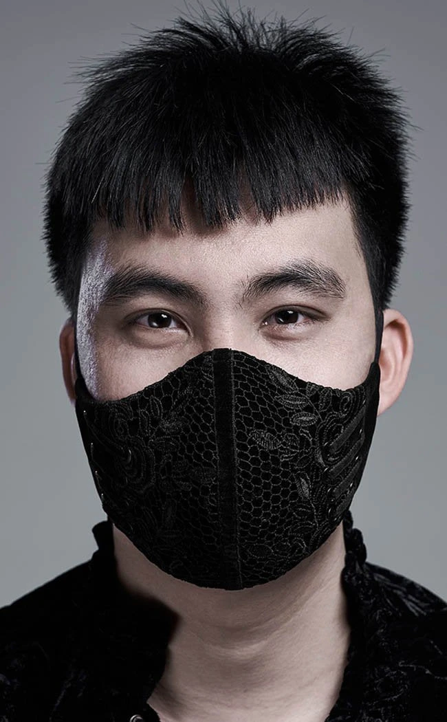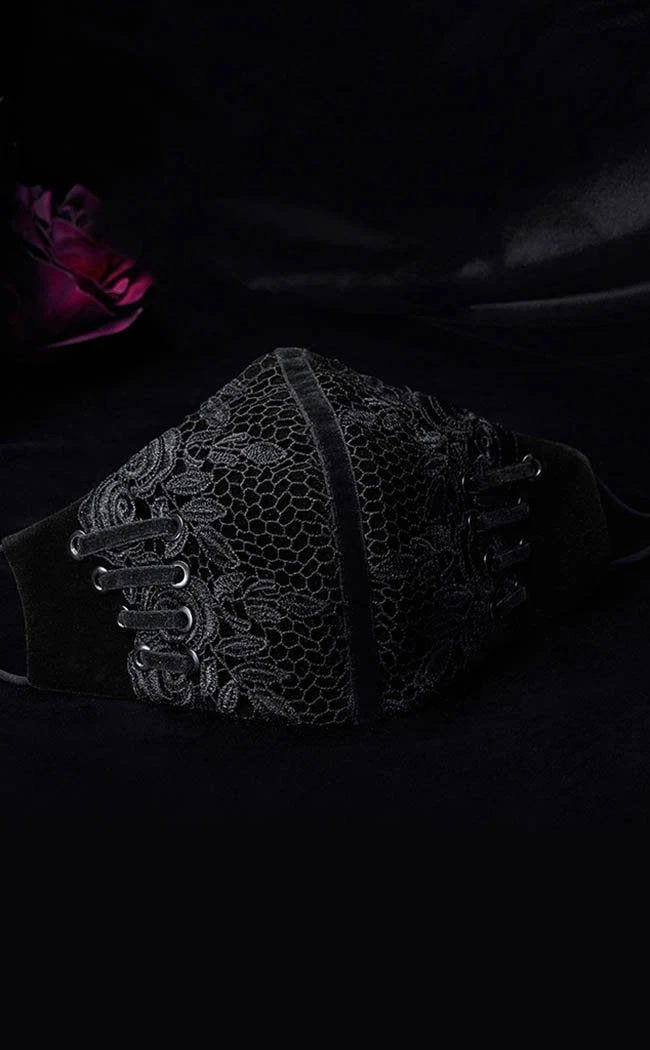 This velvet mas features delicate netting and floral decals as black as your soul. Corseting details on the sides provide a vintage flare for nights when you need to dress up to the nines while staying mask mandate compatible!