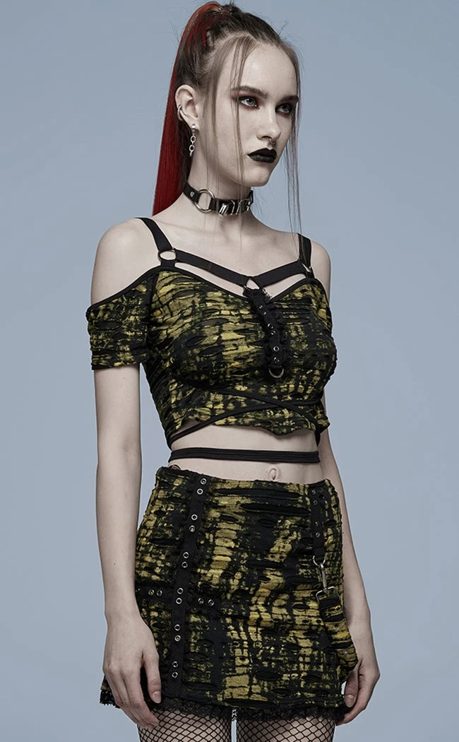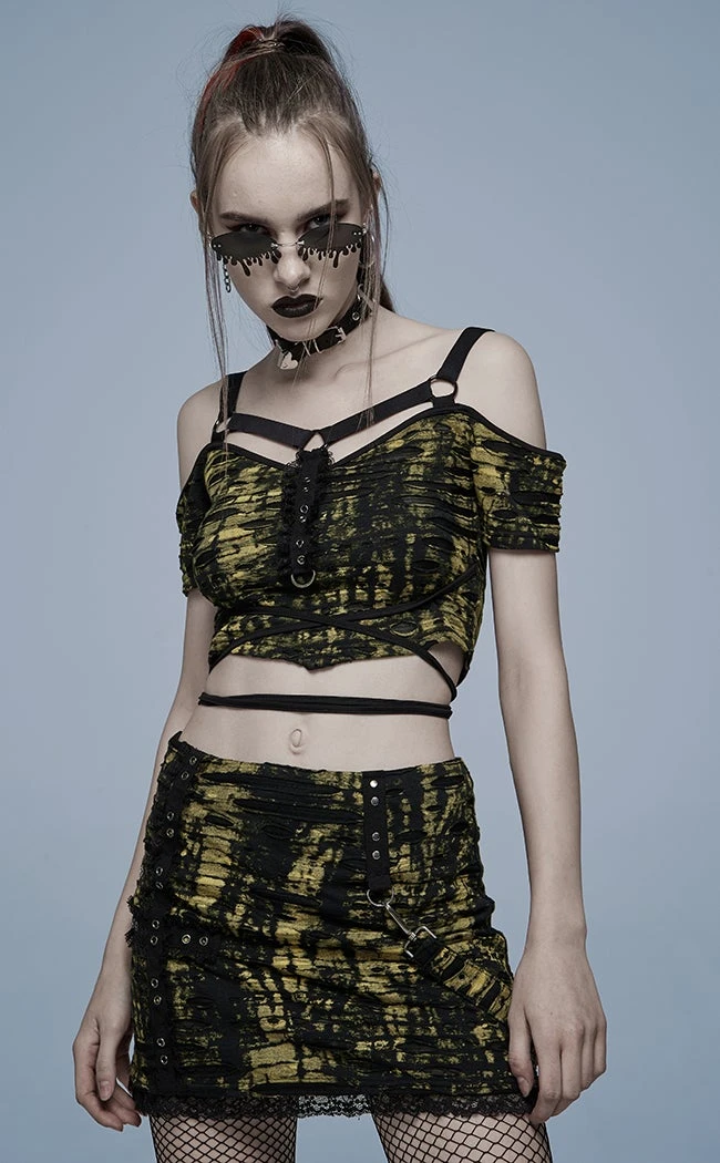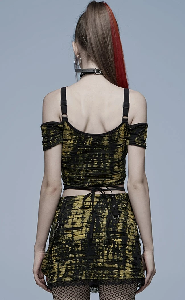The Risen Bardot Crop features toxic yellow and black shredded fabric cut into a flattering crop and bardot neckline trimmed with a badass harness. With extra deets like lace trims, D rings and a waist tie this baby can be dressed up or down for dystopian chic any day of the week!