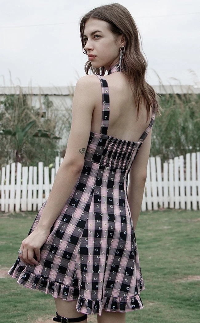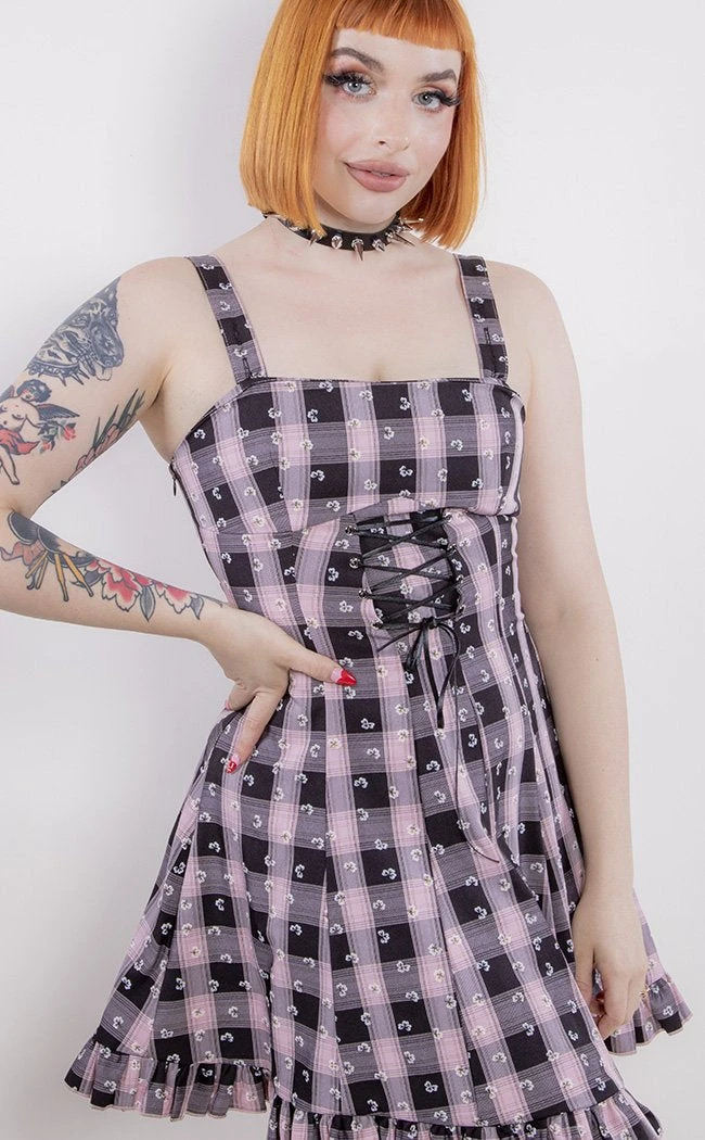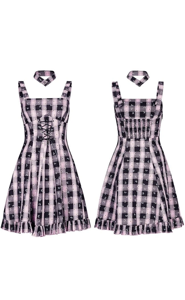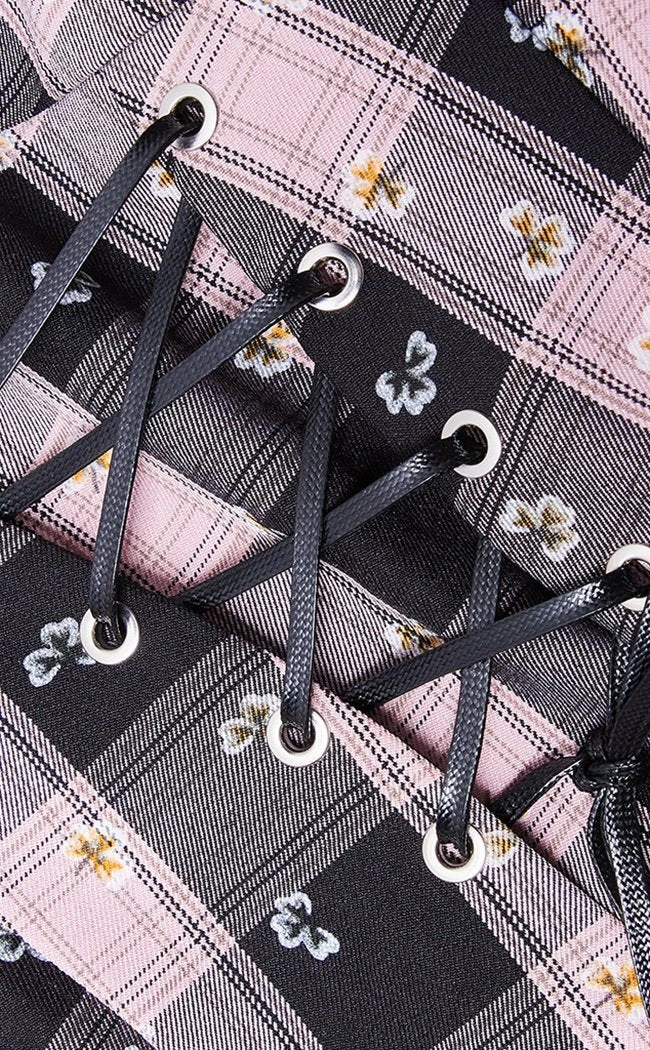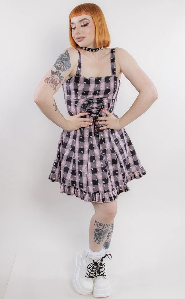 Flaunt yer inner cottagegoth with pastels and frills! This mini is a charming baby pink and black check printed with lucky clovers in white and butter yellow for a little extra luck. The waist is fitted with a corset detail and the skirt is hemmed in ruffles. The ensemble completes with a bonus collar so you’ll never have trouble accessorising!