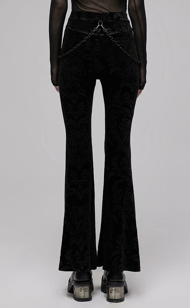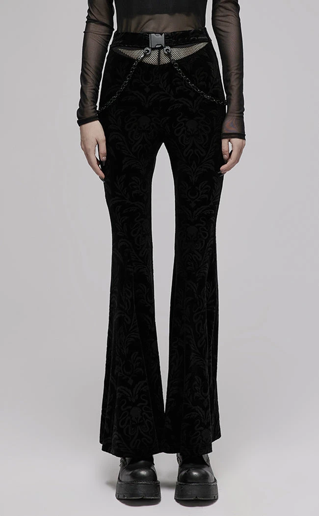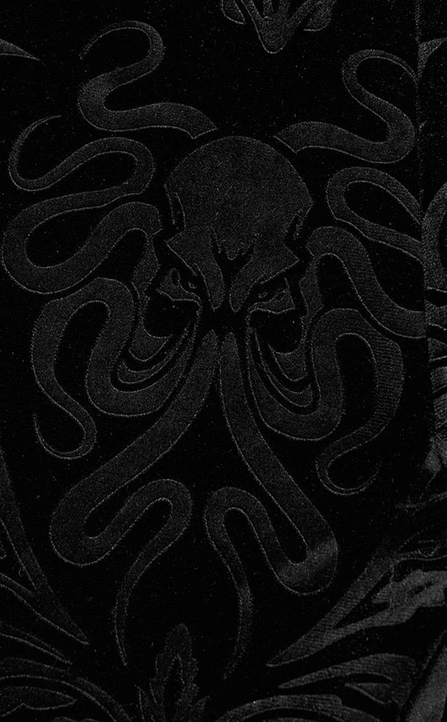 Add some eldritch luxury to yer wardrobe with the Strange Eons Velvet Flares! These babies are fitted and sit high on the waist, showing some skin with a statement mesh panel at the navel. The fabric is embossed with a Cthulhu motif as an extra spooky detail, complemented by the removable chains that hang flatteringly over the hips.