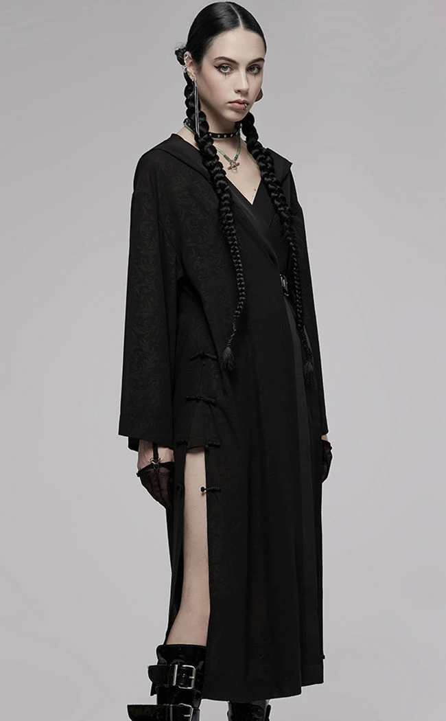 Win the battle against the elements in the Tabitha Belted Cloak! This light cloak features black-on-black baroque patterning, forming an oversized hood and loose sleeves to keep you snug. The cloak can be worn open or closed and fitted with a large buckle and lace tie.