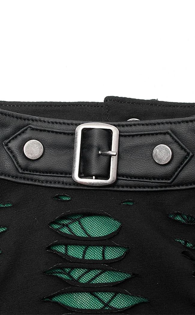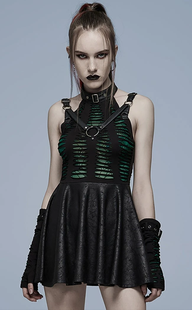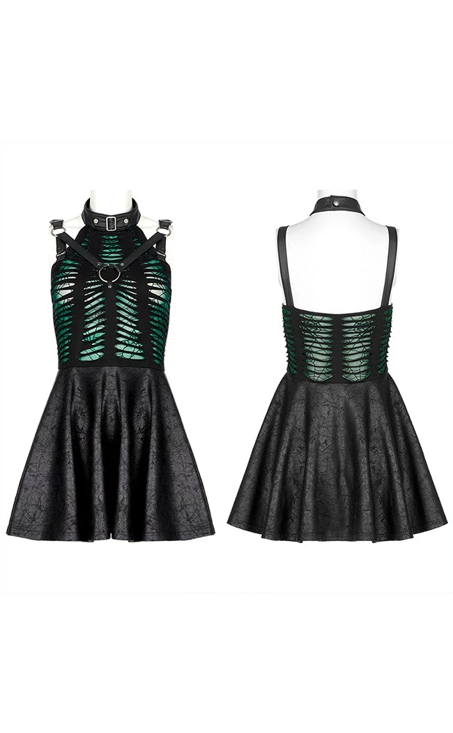 Lure them in with the Wicked Weave Harness Dress! The shredded upper reveals spiderweb mesh under a black stretch outer layer, crowned by luxury faux leather deets like an O ring harness and buckled halter neck. The skirt has a crackled finish to look artfully destroyed to complete the spider-punk lewk.