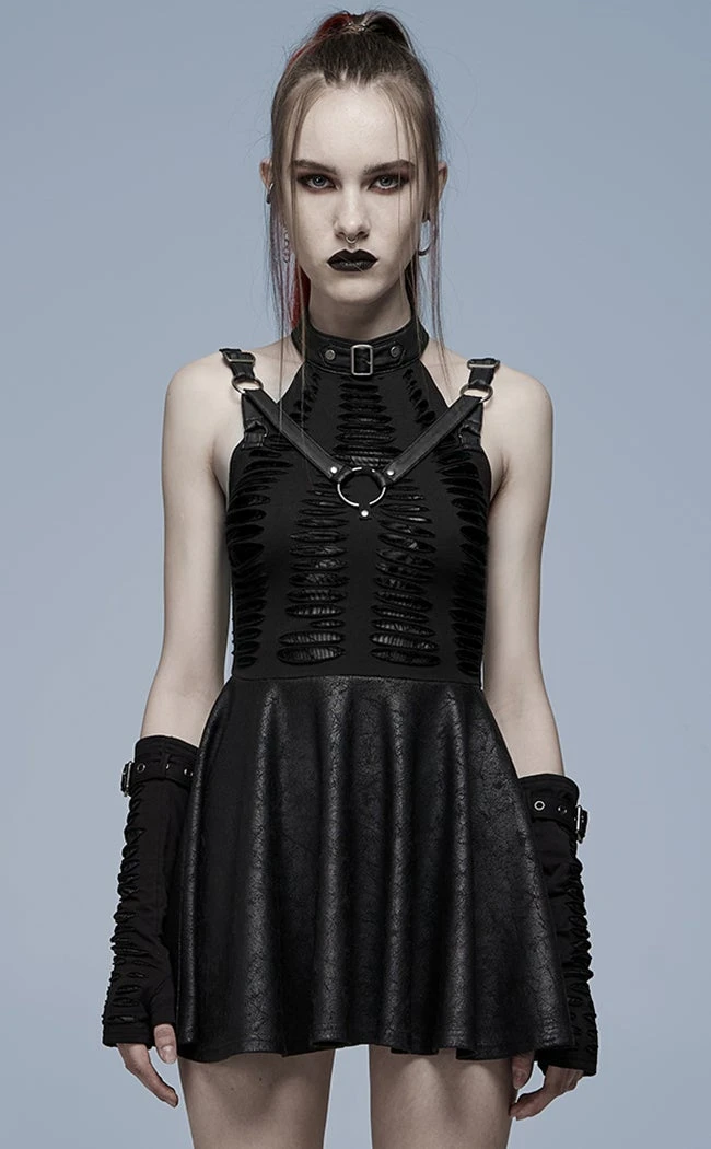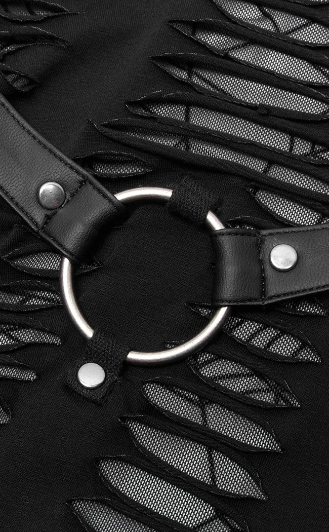 Lure them in with the Wicked Weave Harness Dress! The shredded upper reveals spiderweb mesh under a black stretch outer layer, crowned by luxury faux leather deets like an O ring harness and buckled halter neck. The skirt has a crackled finish to look artfully destroyed to complete the spider-punk lewk.
