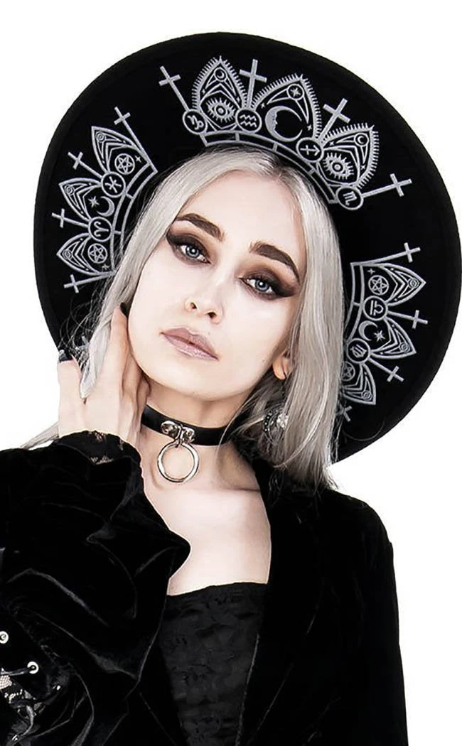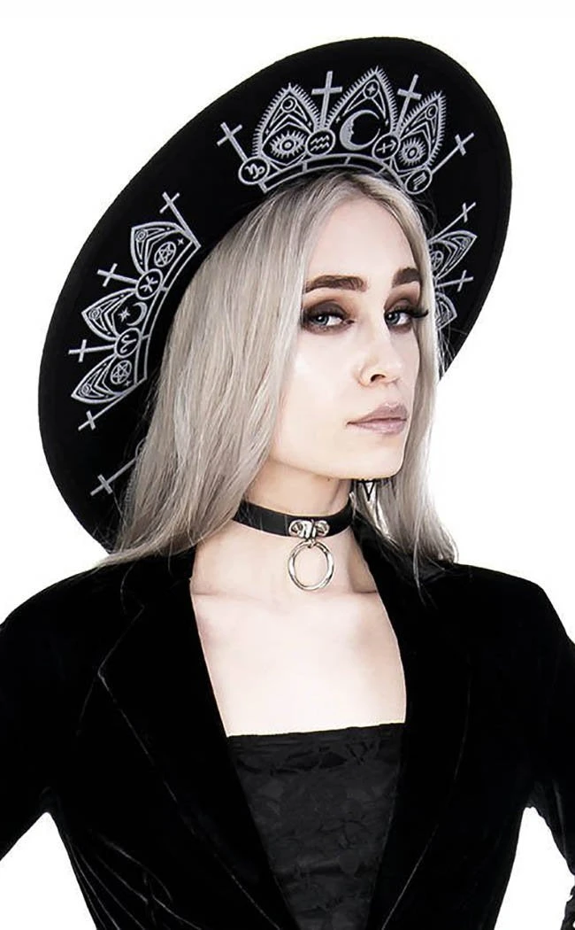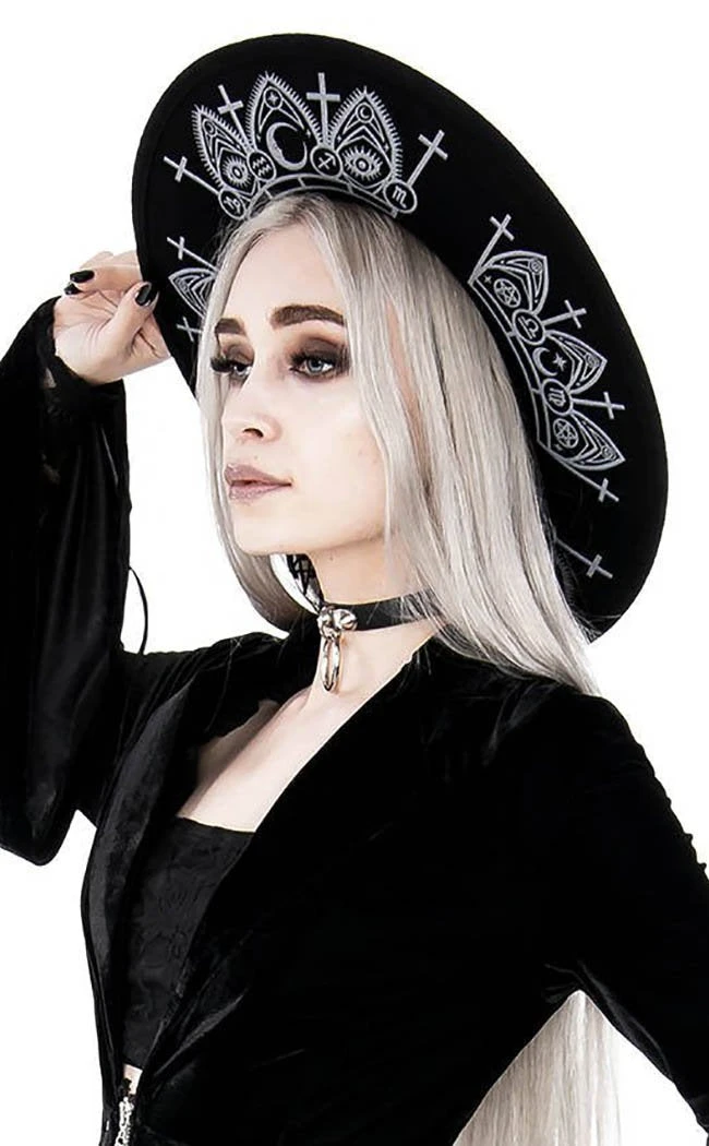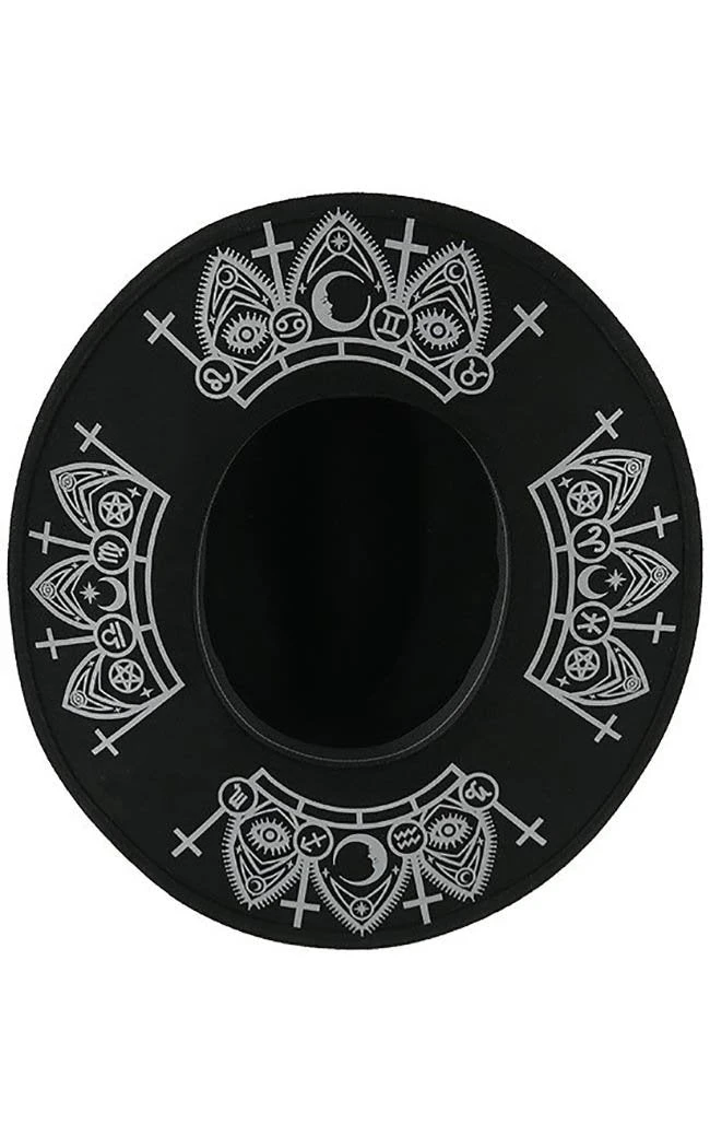 Surround yourself with a halo of occult elegance! Mystic symbols in a lacy print fan out over the brim in soft grey. The woolen hat has been stiffened to keep its shape, making it perfect to dress up any outfit with a touch of mystique.