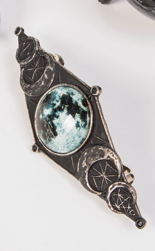 Let your locks glow with the light of the moon! This barette puts the full moon on display under a magnifying glass charm. This is set into a metal backing embossed with geometric patterns.