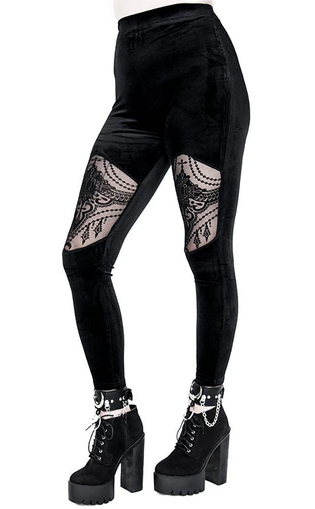 These sleek velvet leggings had a thick, elastic waistband for comfort and figure-hugging goodness. The thighs feature a mesh cutout decked out in Restyle’s signature fortune teller motif.