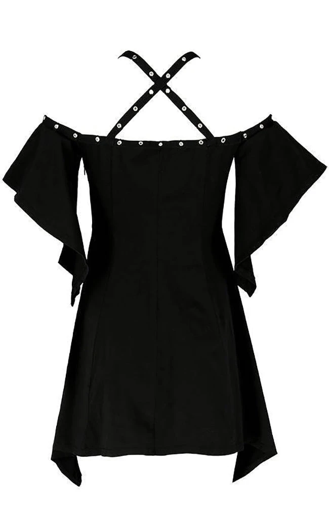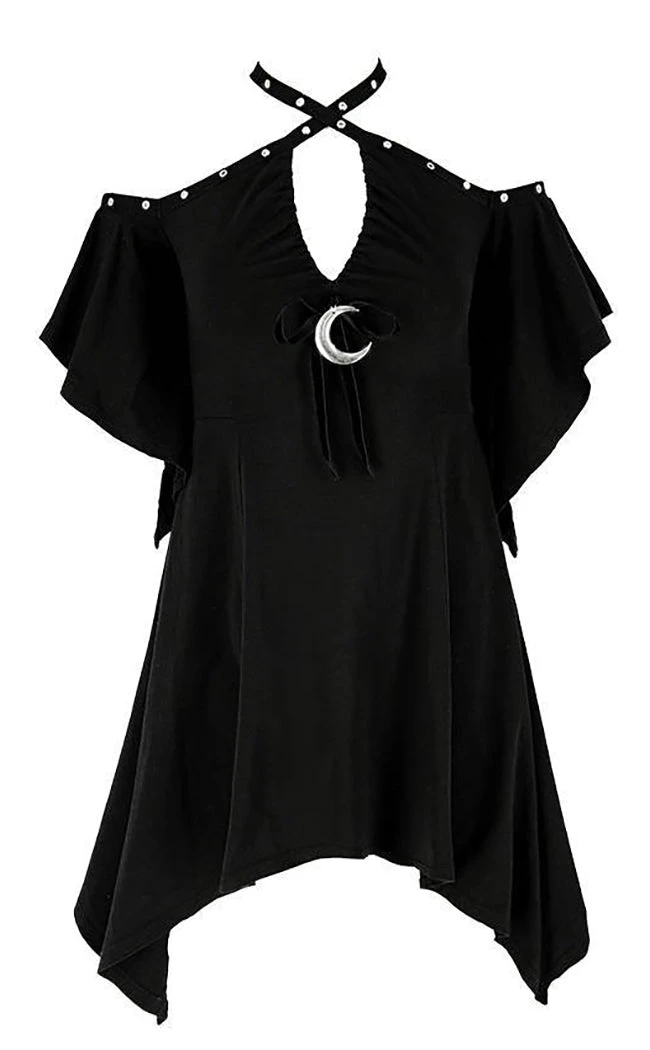 Dressing in flowing lines and floaty vibes with the Calista Tunic Dress! Soft, breathable cotton forms this off-shoulder dress that features an asymmetrical hem and butterfly sleeves for a delicate touch. Eyelet shoulder straps can be crossed or worn in a bardot style, framing the plunging V neck to flatter the bust along with a large crescent moon charm and ribbon.