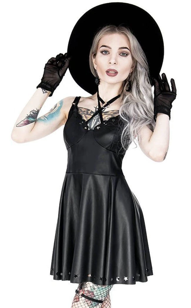 No baddie witch’s wardrobe is complete without a faux leather piece! Moon and star cutouts scatter along the neck and hemlines, with the dress material being form fitting and stretch at the chest.