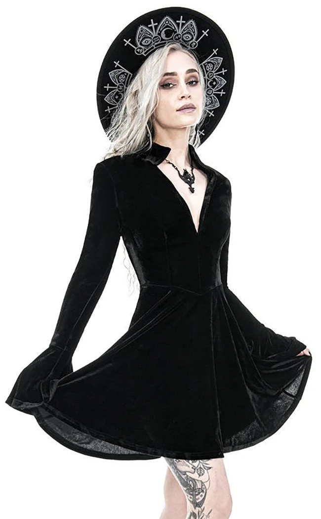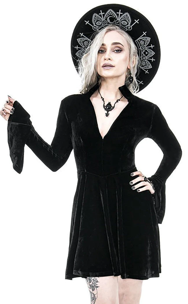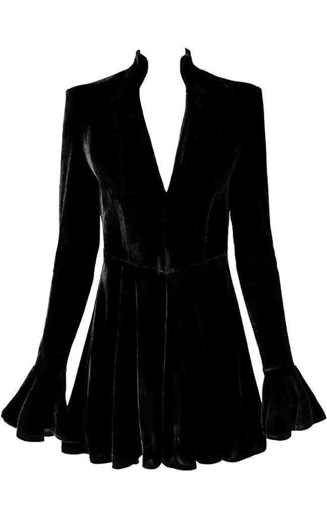 The Draculina Dress is a chic modern piece formed from soft velvet into long sleeves with ruffled cuffs, an A-line length, plunging V neckline, and a high collar.