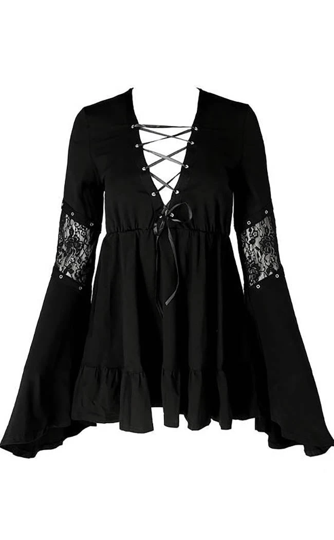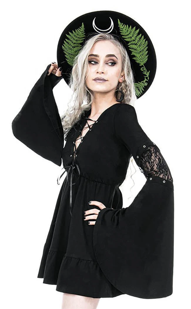 Become a modern enchantress in the Eden Floaty Dress! Eden is airy and floaty, with a high waistline, a frilly hem and dramatic bell sleeves. The lace sleeve panels and deep lace-up V neck add a classic Romantic touch, embellished with statement eyelets.