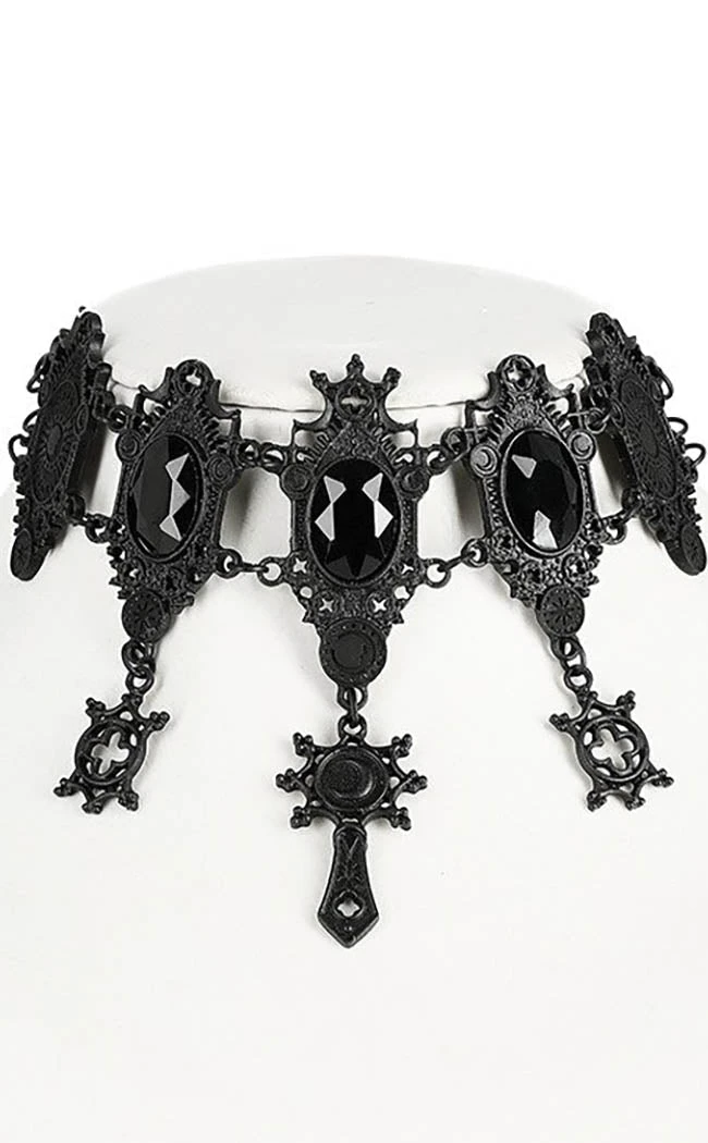 Feel your felicitous future in the Fortune Teller Choker! 5 ornate, antique-look frames connect with delicate chains, 3 of which are adorned with glittering faceted black gems. The same 3 frames also feature hanging openwork charms for that extra touch of gothic elegance.