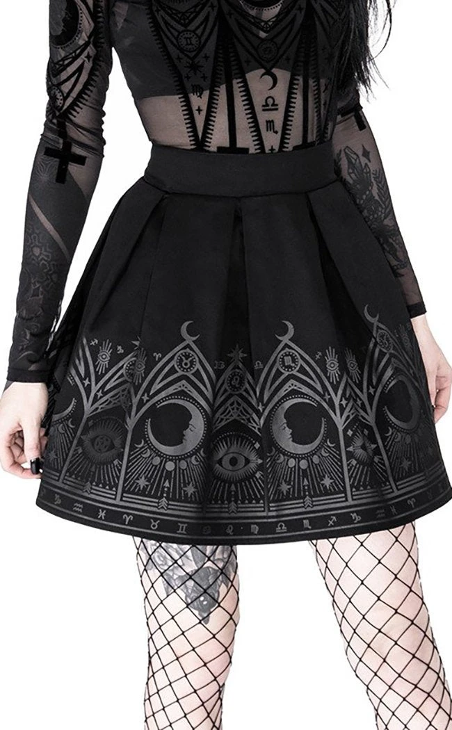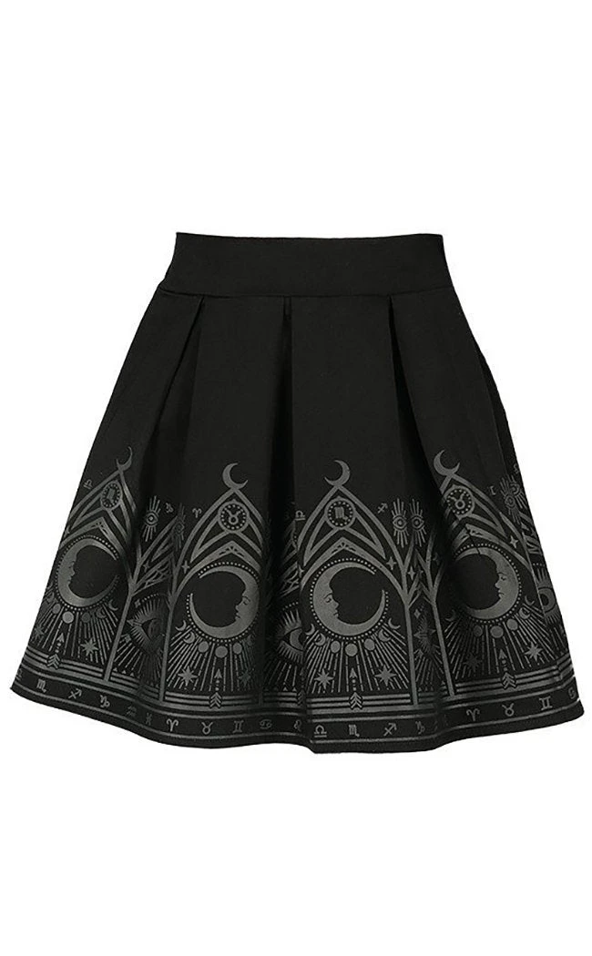 If you’re looking for versatility in a staple wardrobe piece that you can dress up and down, the Fortune Teller skirt is exactly what you need. The skirt is made with a durable, thick cotton printed with Restyle’s signature fortune teller motif, featuring cathedral windows and ocult symbols. The thick band sits high on the waist and the skirt secures with a hidden side zip.