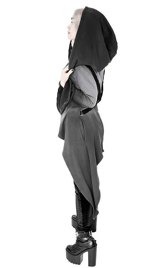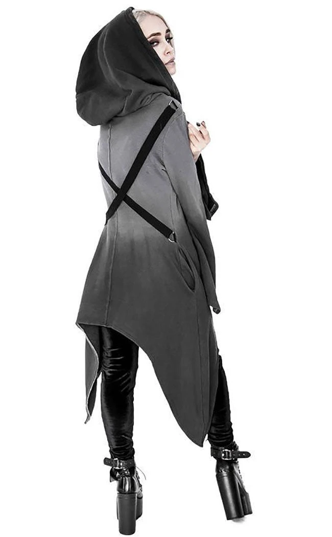 Beginning at the hood, this jacket goes from stormy grey into mist and back again, black statement straps crossing the back and connecting by D-Rings. The front fastens with a silver carabiner and internal latch, folding over itself in a unique drape.