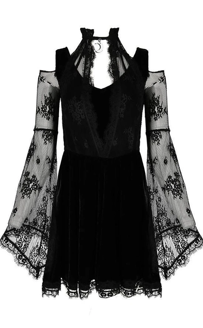 Get into shrieking banshee eleganza with Restyle’s Layered Lace Dress! The upper features an outer layer of lace that forms a floating halter, shoulder cutouts and bell sleeves that sit over the velvet bodice. The shoulder straps are fitted with silicone straps to avoid slipping. The skirt is entirely velvet with a flowing skater cut, ending above the knees and trimmed in lace to tie the piece together.