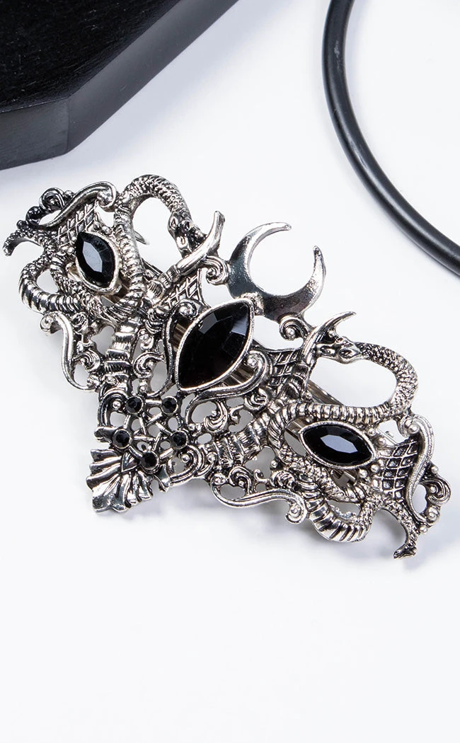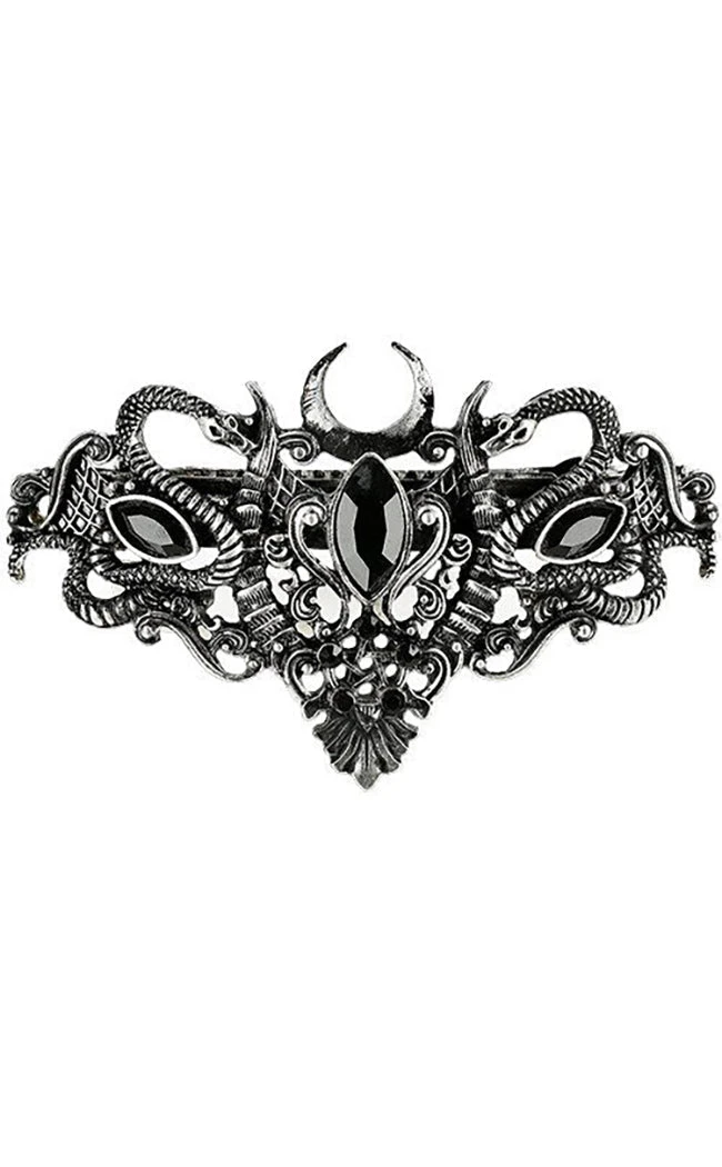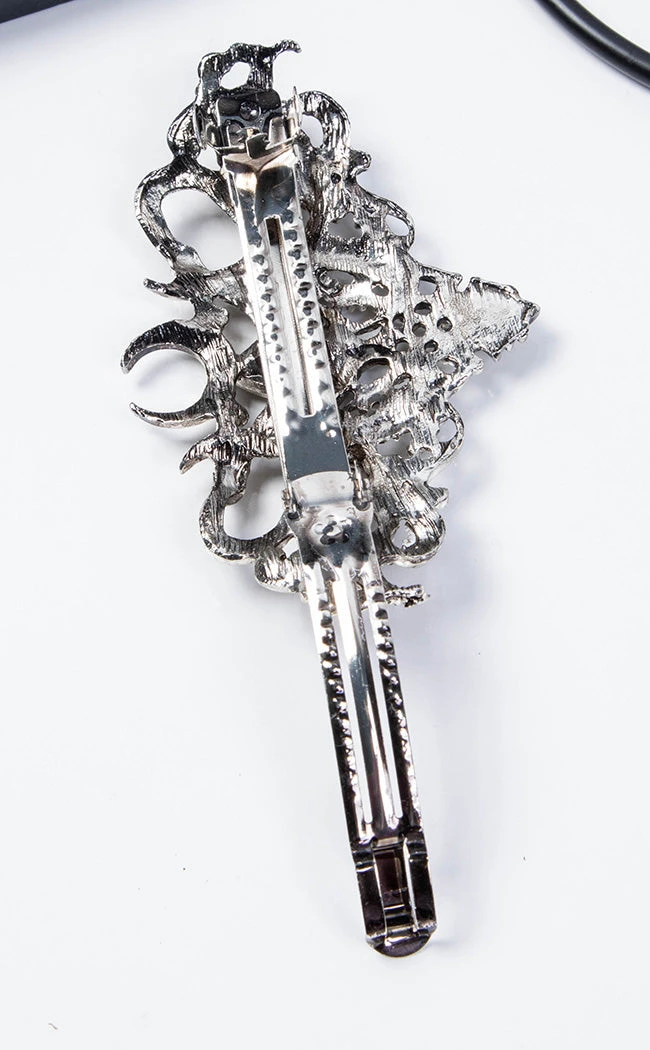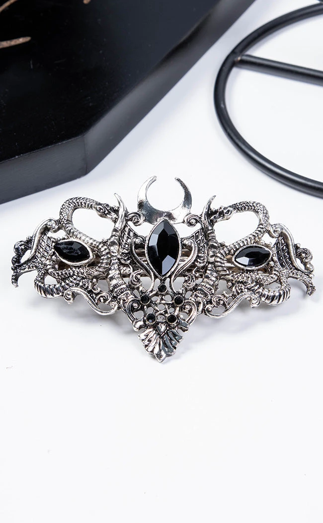 Metal with an antique silver finish forms a twisted design of devil’s horns, snakes and crescent moons inset with 3 faceted black gems. The strong automatic clasp allows this barrette style clip to sit securely and comfortably in your hair all day.