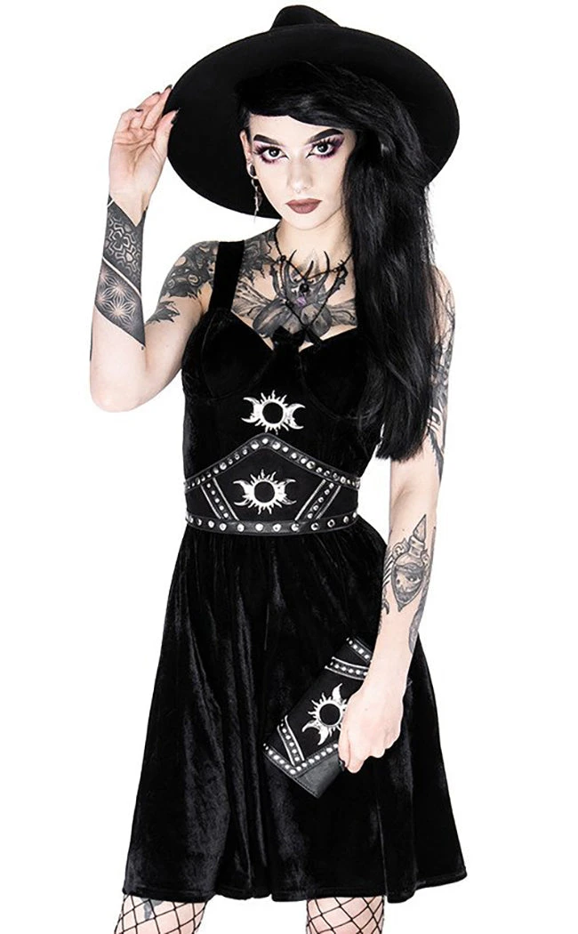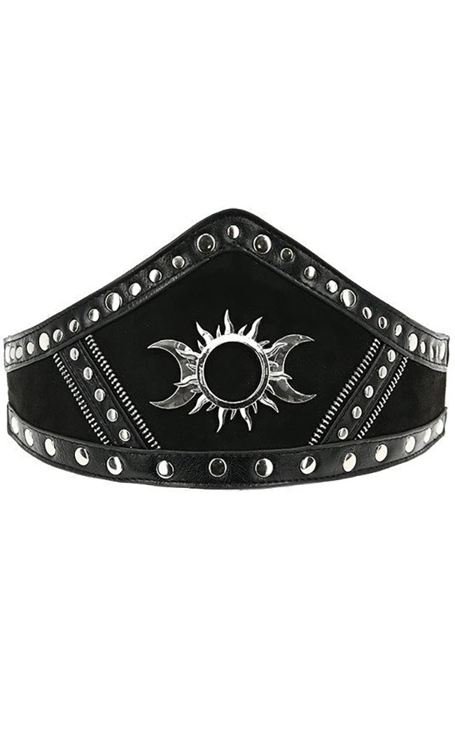 The Triple Goddess Waist Belt is a stunning statement piece that fits easily over tops and dresses. The large, pointed band is formed from high-quality faux leather that frames elegant faux suede panels. The leather is trimmed with studs, zipper teeth and a triple goddess symbol at the centre. The belt fastens with two snap buttons fitted to the high stretch elastic band at the rear.