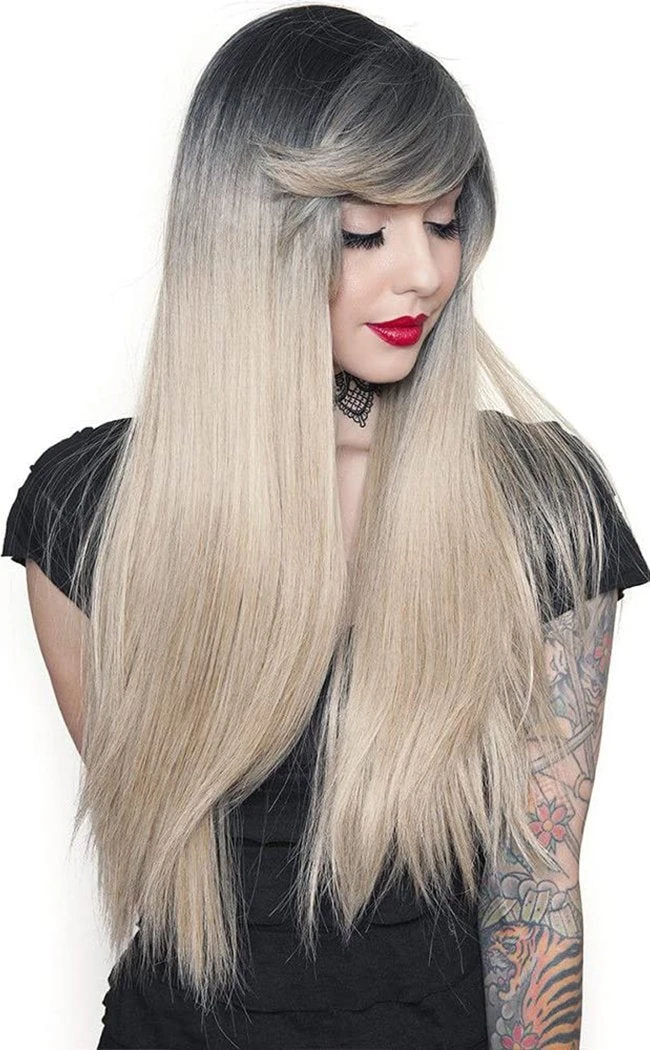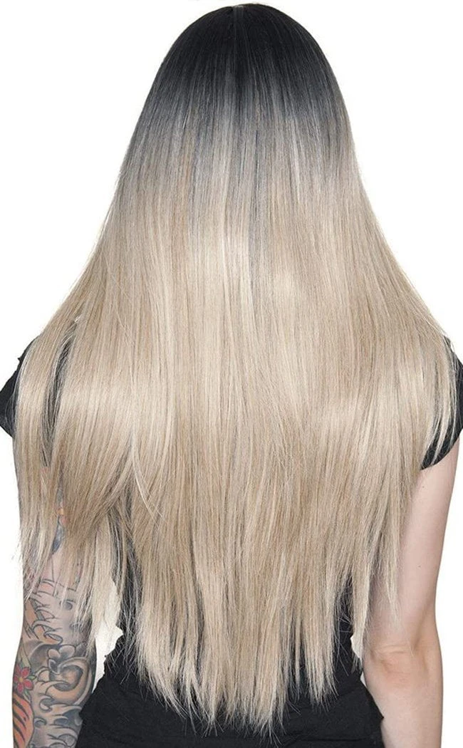 You are about to find out if blondes have more fun! This sexy blonde wig will have everyone thinking that you have changed up your look overnight. This straight blonde wig with dark roots is approximately 65cm in length with a side fringe. It is built onto a netted cap base with adjusters on the inside as well as slide combs.Â