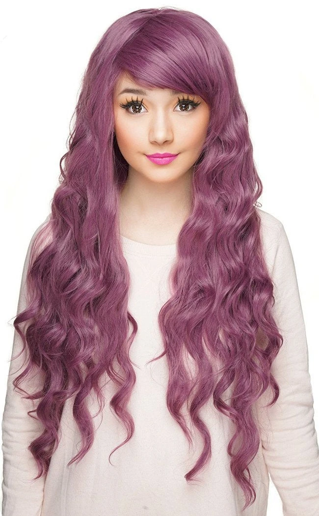 The most purrfect gothic lolita wig in dusty plum purple. Style has loose cascading curls and long, side-swept bangs which can be trimmed or styled to suit your face.