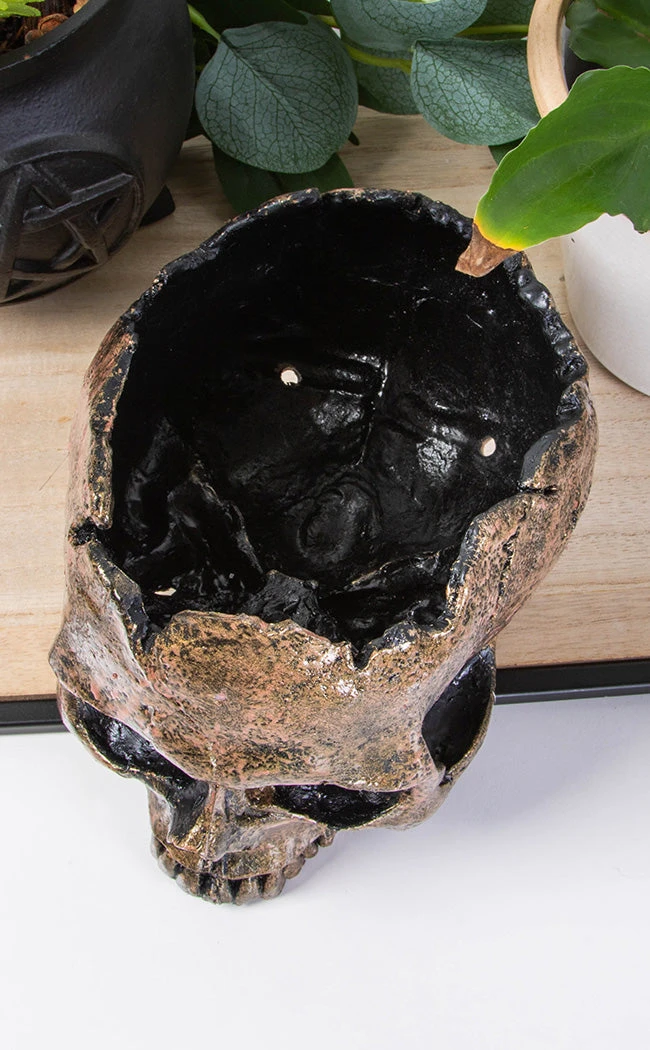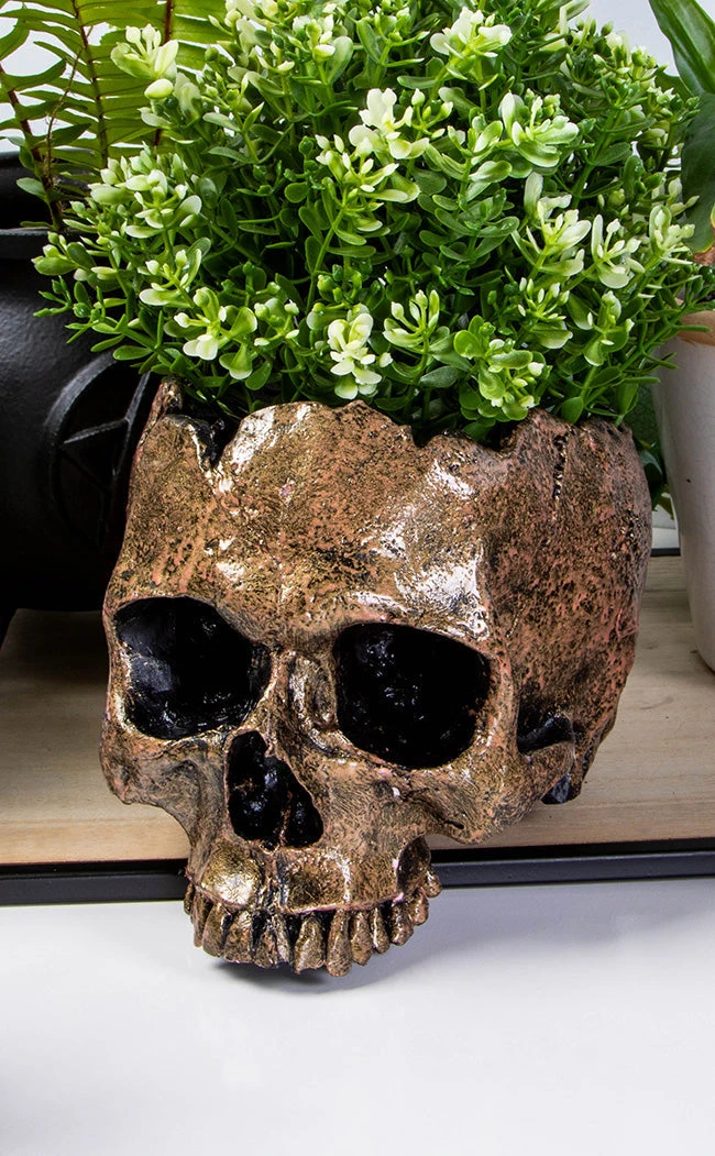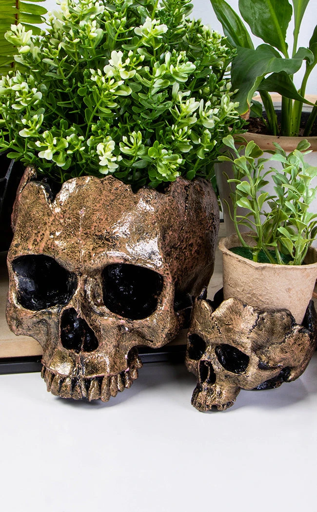 Let your plants bloom from the beauty of natural decay with the Large Skull Planter! This hand cast statement planter is shaped like a skull with an open top, creating a stunning statement piece for green witches and your spikiest succulents. Use as a planter, brush holder or morbid vase!