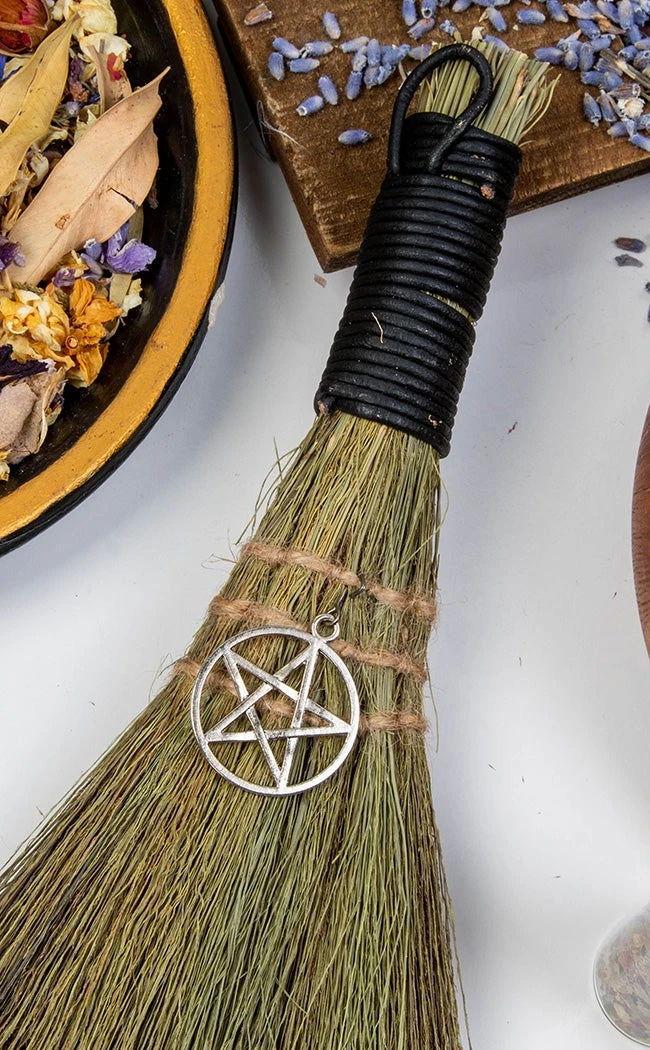 This besom is a versatile handheld broom of stiff grass, bound and decorated with a pentacle symbol.