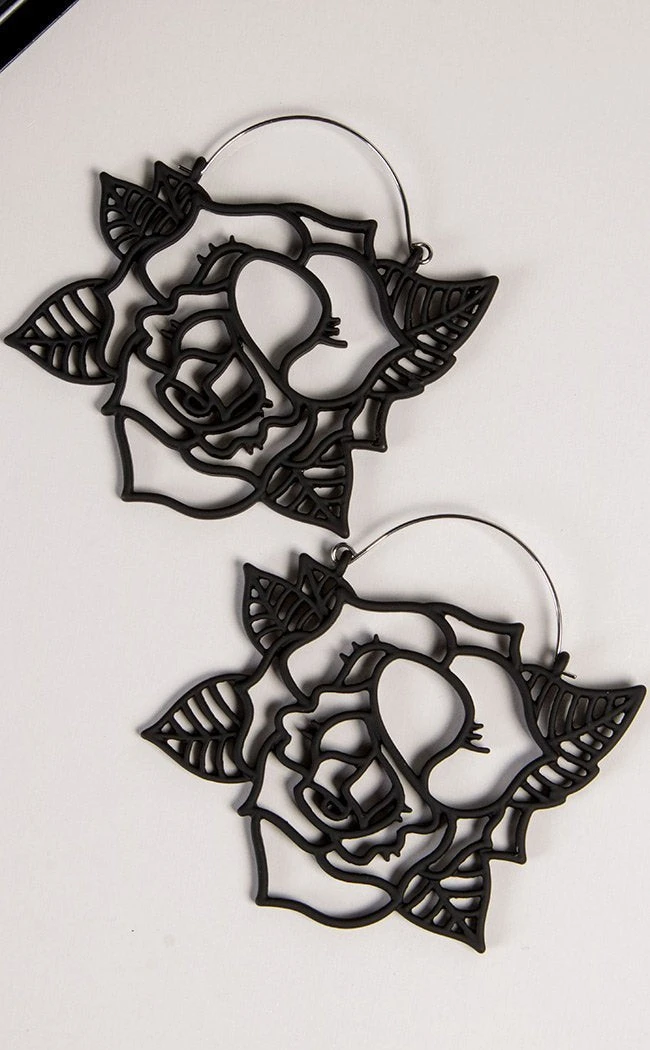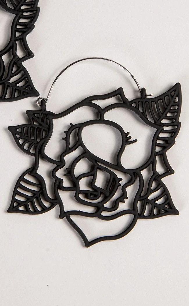 These earrings are a beautiful set of black openwork roses, they have a matte finish and sit super lightly in the ear.