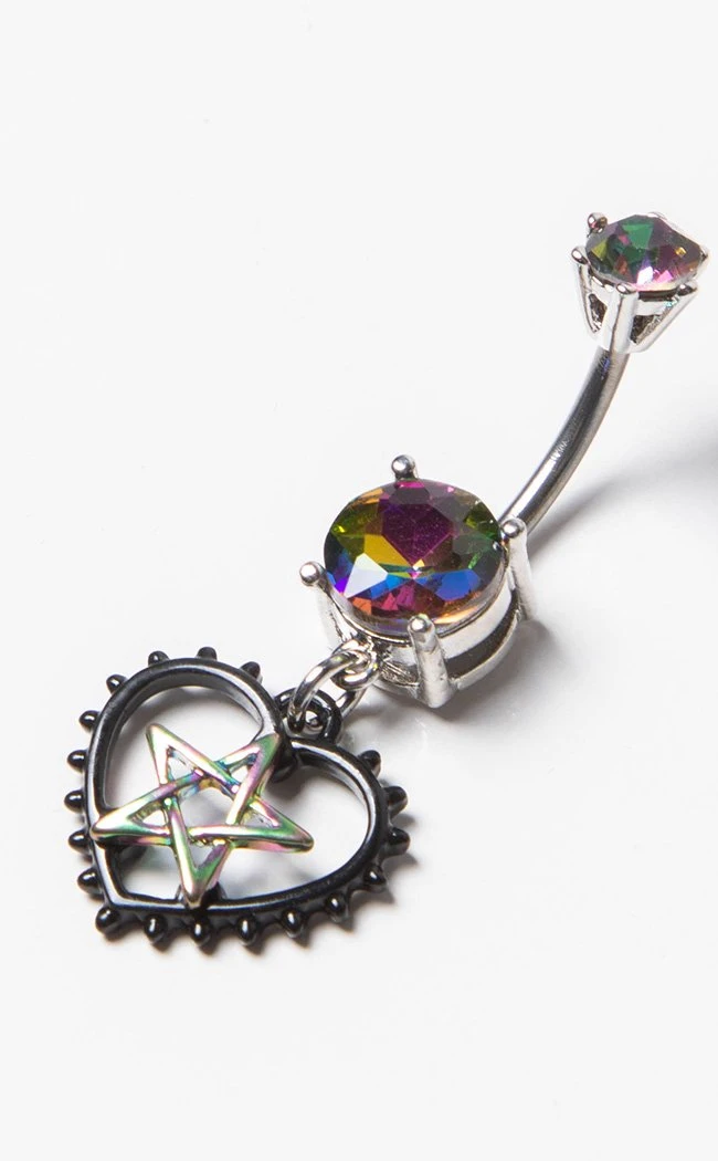 The devil has my heart! A holographic pentagram sits inside a black heart, which dangles from a bar fitted with matching iridescent crystals.