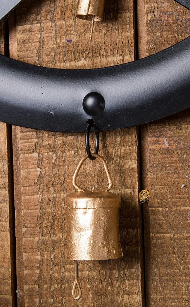 Occult wind chime featuring a pentagram in black with bells. Made from metal and built to last. Let the bells ring in the wind and fill your home with good energy.Â